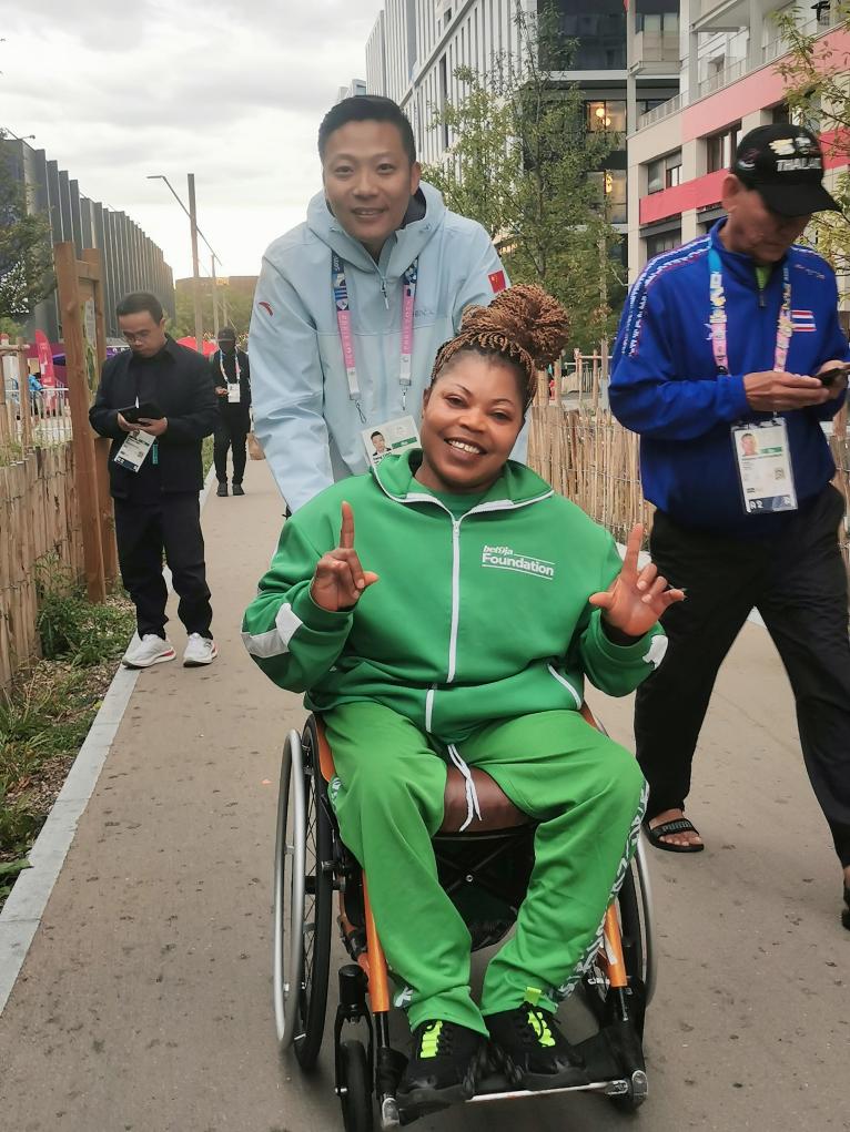 9月3日,中国田径队队医高奉在前往赛场的路上遇到了一位坐着轮椅的尼日利亚选手,她在经过一个上坡路段时十分吃力。高奉见状便上前帮她推到了食堂入口,两人在路上留下了一张记录友爱的合影。