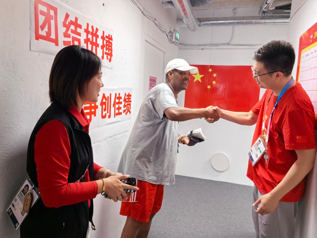接过物品时,他说,这已经不是中国队第一次向他们伸出援手了。在5月的世界残疾人田径锦标赛上,他们丢失了引跑绳后,也是中国队提供了帮助。