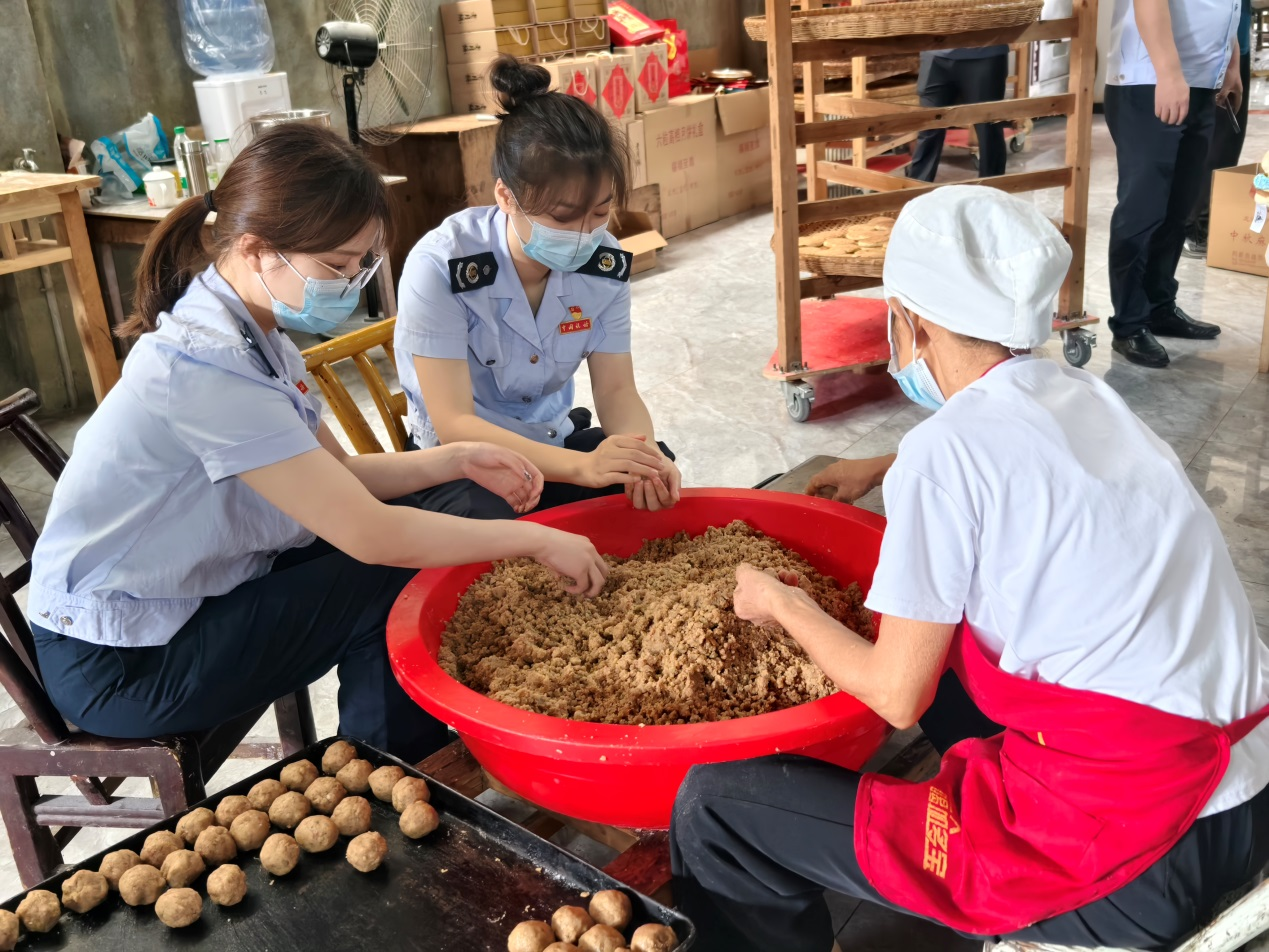 税务青年干部一边学习着工人师傅们熟练的操作,体验制作传统佳肴的快乐;一边了解工厂的生产经营情况,宣传支持个体工商户和小微企业发展的税费优惠政策。