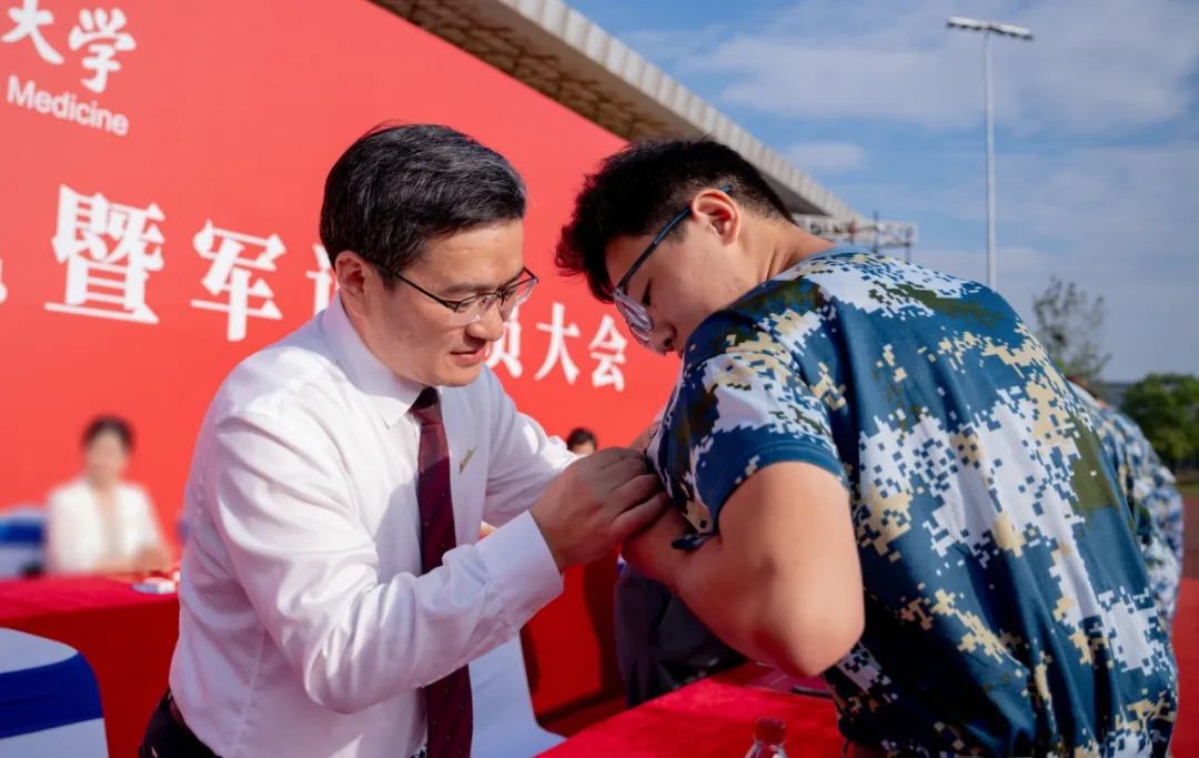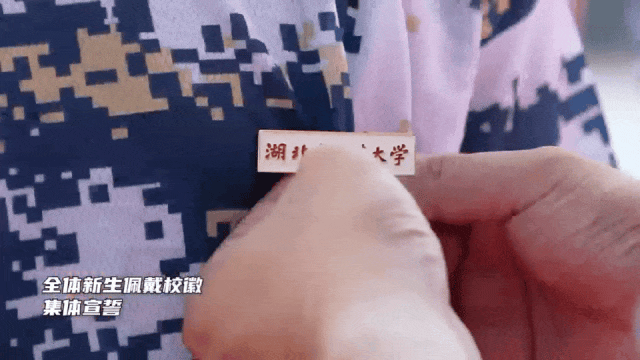 佩戴校徽庄严宣誓,校领导、专家代表为新生代表佩戴校徽,祝贺他们成为湖北中医药大学人。