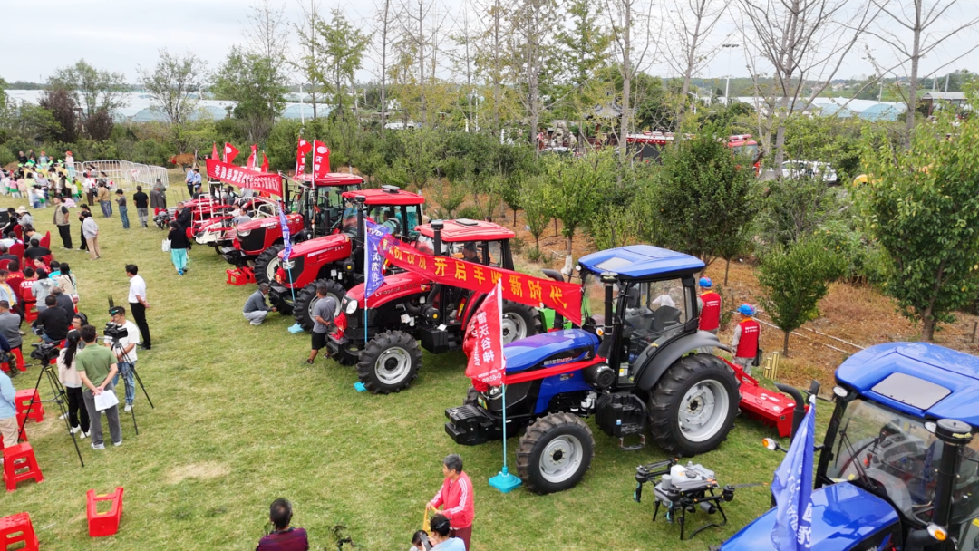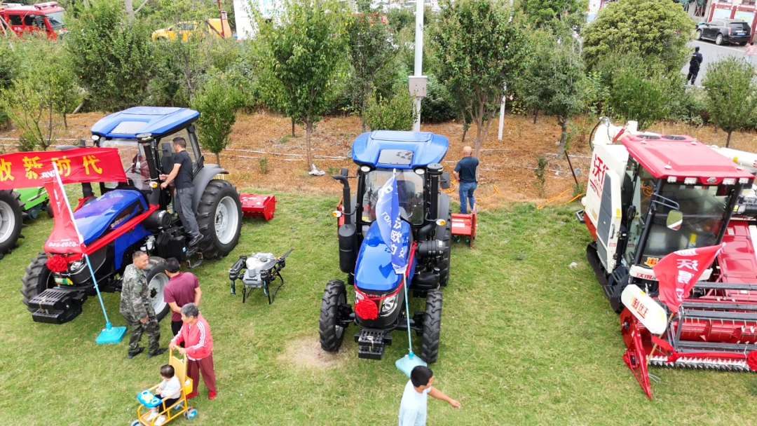 农业机械展示区,同样热闹非凡。大中型拖拉机、联合收割机、无人机等十余台高大威武的农业机械整齐排列,令人眼花缭乱的农机装备,吸引了众多农民前来参观。