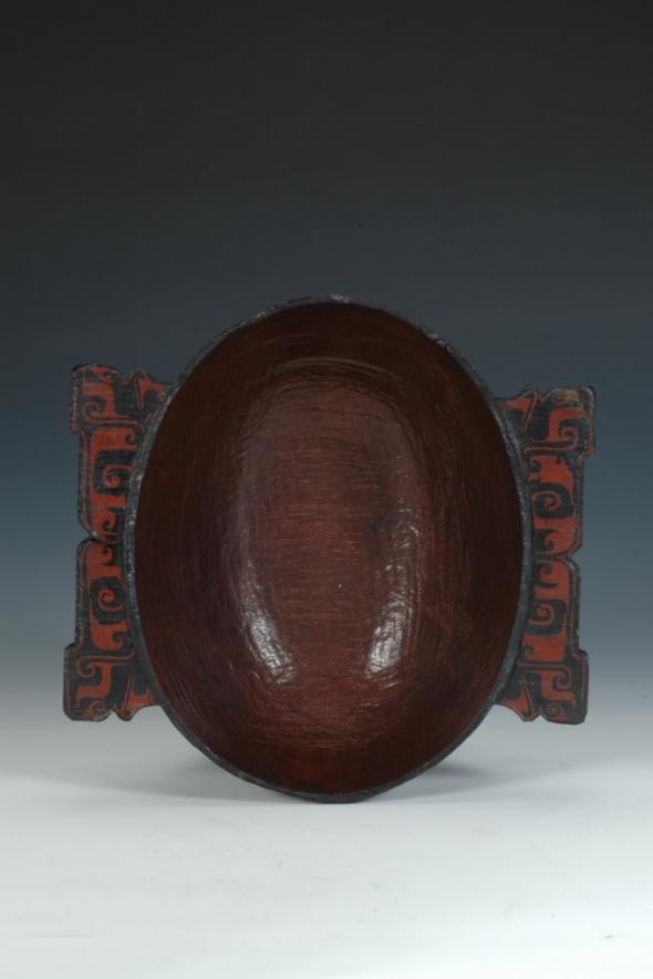 展厅的这件耳杯口长24.4厘米,容积约1600毫升,属于超大型耳杯,不太适宜作为直接奉饮的酒具,可能是作为盛放羹汤、鱼、肉、果蔬的食器使用。