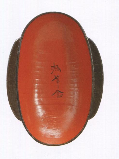 荆州博物馆珍品馆展出有10件耳杯,下面介绍其中容积最大的、形制较古朴的一件(图二)。这件耳杯出土于荆州雨台山161号楚墓,器型较大,口呈椭圆形,口长24.4厘米,宽18.4厘米,两侧各有一方形耳,耳中部有凹缺,耳下有一凸起,连耳宽24厘米,耳面高于口沿,腹深6.8厘米,整器高7.4厘米。器内髹红漆,器外髹黑漆,耳面和口沿外侧朱绘卷云纹形态的凤鸟纹。