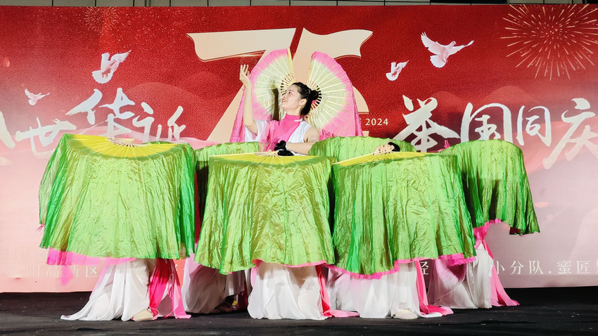 随着《最美是你》和《我的祖国》两支舞蹈的旋律响起,整场文艺汇演正式拉开帷幕。在接下来的节目表演中,独唱《绿色的军衣》、扇子舞《铸就中华魂》、模特秀《关关雎鸠》、弦乐演奏《走向复兴》等精彩节目轮番上演,演出一度达到高潮。在场的高阿姨说,节目丰富多彩,无不体现了现在的好时光,祝祖国繁荣昌盛。