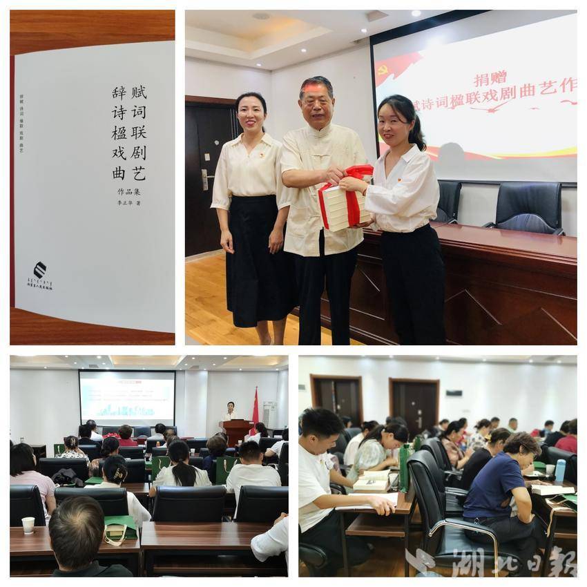 会上,曾任全国百家文化站联谊会秘书长、湖北省诗词学会、楹联学会、书法家协会会员的社区党员李正华带来他最新作品——《辞赋诗词楹联戏剧曲艺作品集》,该书收录了他主要著作辞赋29篇、诗词141首、楹联243对、戏剧10篇、曲艺21篇。
