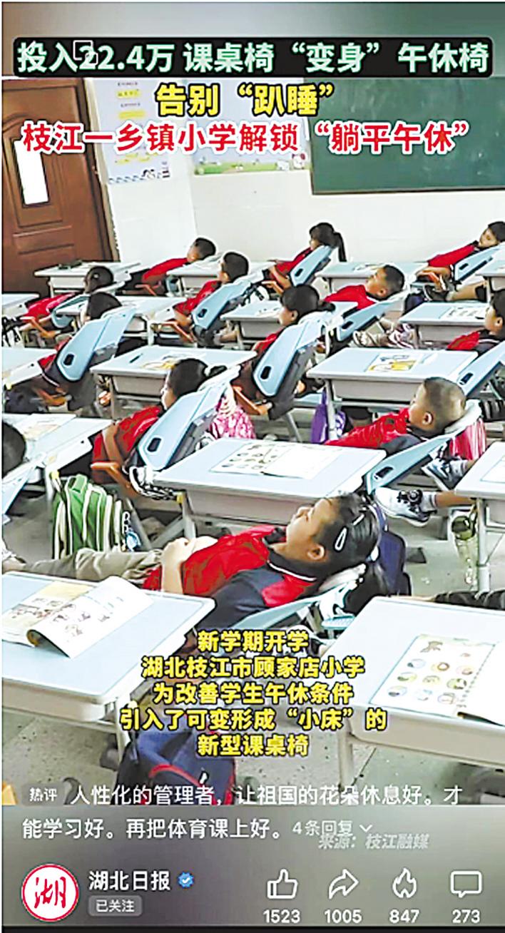 借助湖北日报区域超级传播平台,午睡躺椅全媒报道实现了“一鱼多吃”,影响力进一步扩大。各地网友纷纷留言,给枝江顾家店小学点赞,并希望更多孩子能“躺平”式午休。