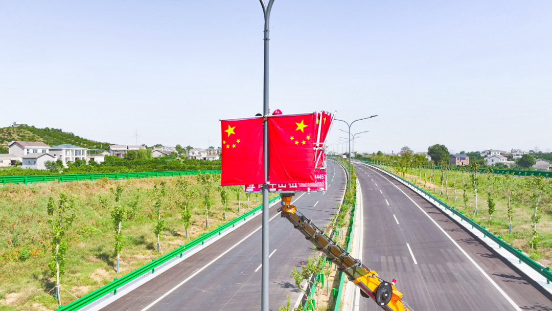 宜都街头,工作人员对现场施工方安全标识、警示牌等安全设施进行了先行检查,在确保施工工人、过往车辆和行人安全的前提下组织施工。在悬挂国旗时,严格对悬挂位置、角度等进行把关,确保整齐美观的同时保证紧固安装。