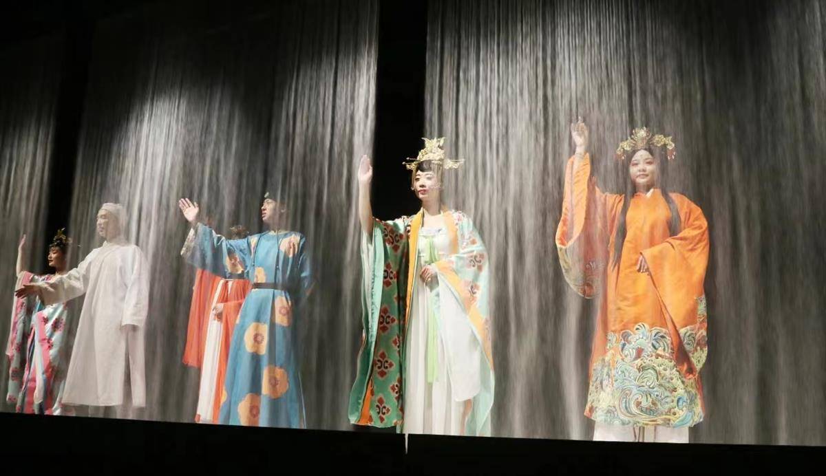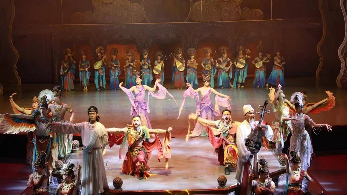 洞窟体验剧《乐动敦煌》则让人一睹古郡敦煌的“乐”宴盛景。石门移开,金光射出,弹琵琶的西域音乐天才白氏,带领众人开启一场千年敦煌乐舞之旅。该剧用全息投影、3D威亚等高科技手段,以全沉浸式的呈现方式,给人以强烈的现场感。剧中运用了琵琶、排箫、阮等民族乐器及仿制敦煌古乐器的音色,通过胡旋舞、腰鼓舞、琵琶舞等典型舞蹈,展现敦煌壁画中的乐舞盛景。观众在剧场行走、与演员互动,零距离领略敦煌艺术诗、舞、音、画的璀璨。