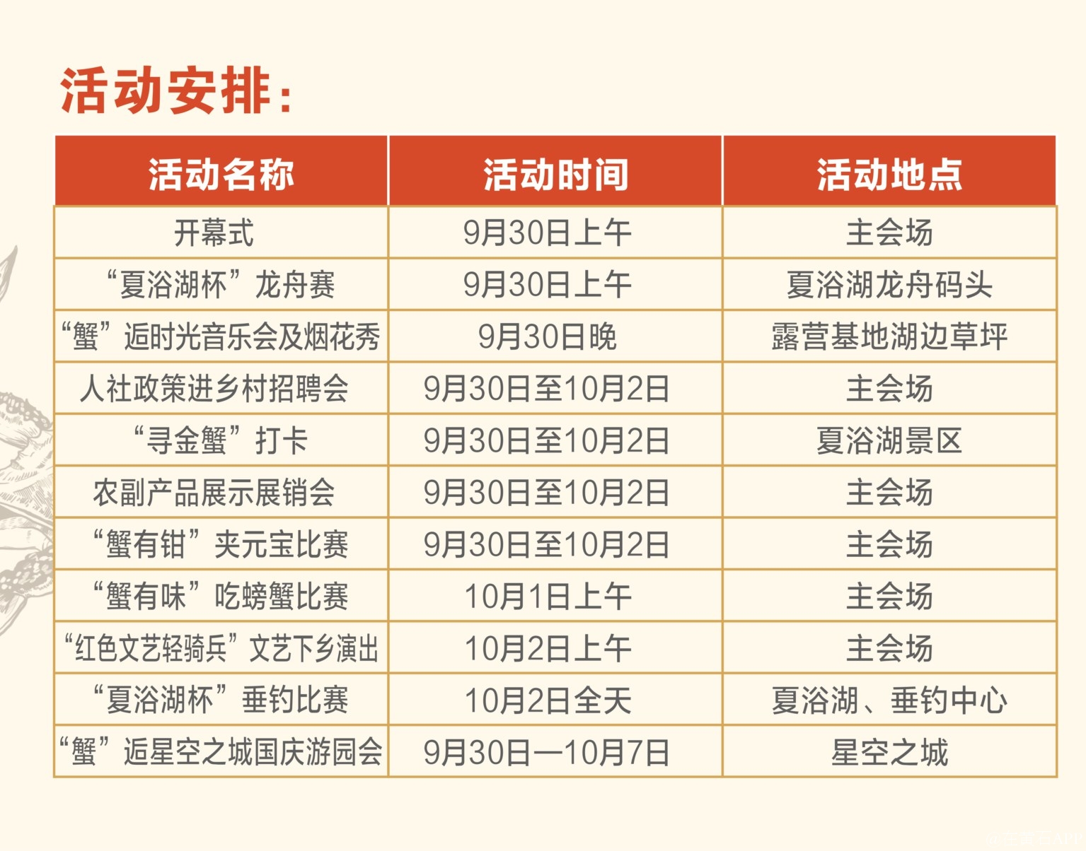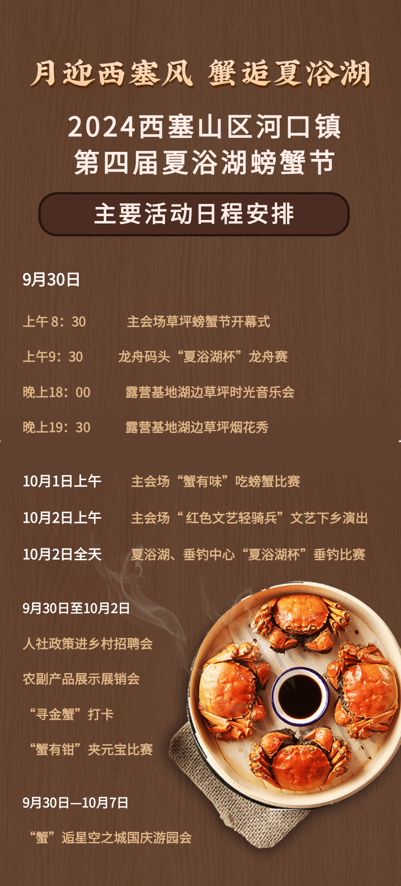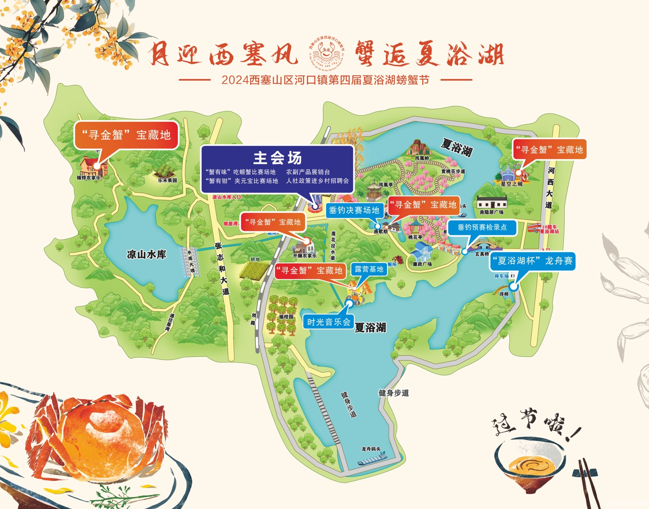 (夏浴湖景区9月30日至10月2日,全天)“寻金蟹”探索游戏,在星空之城游乐园、渔歌舫、开颜农庄、锦烨农家乐、露营基地,五个打卡点,集齐五个小印章就可以获得精美礼品!!!