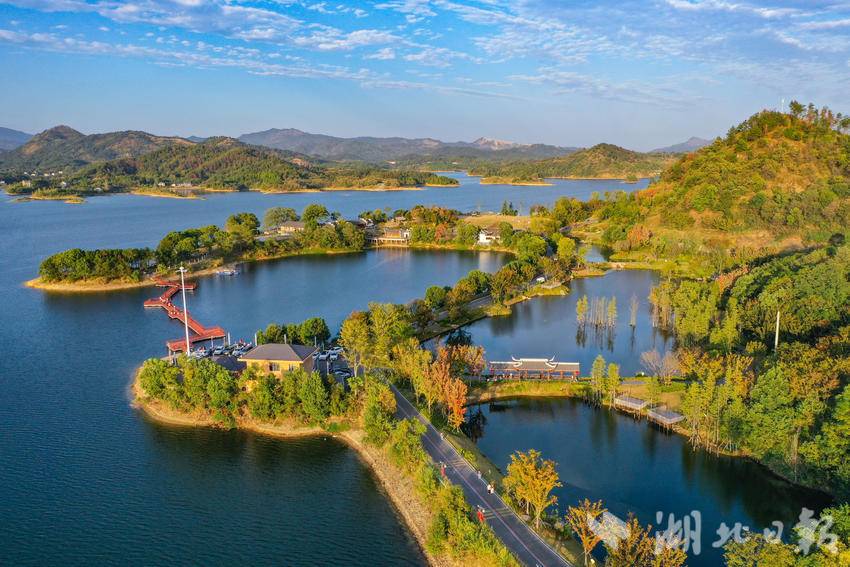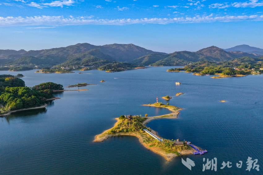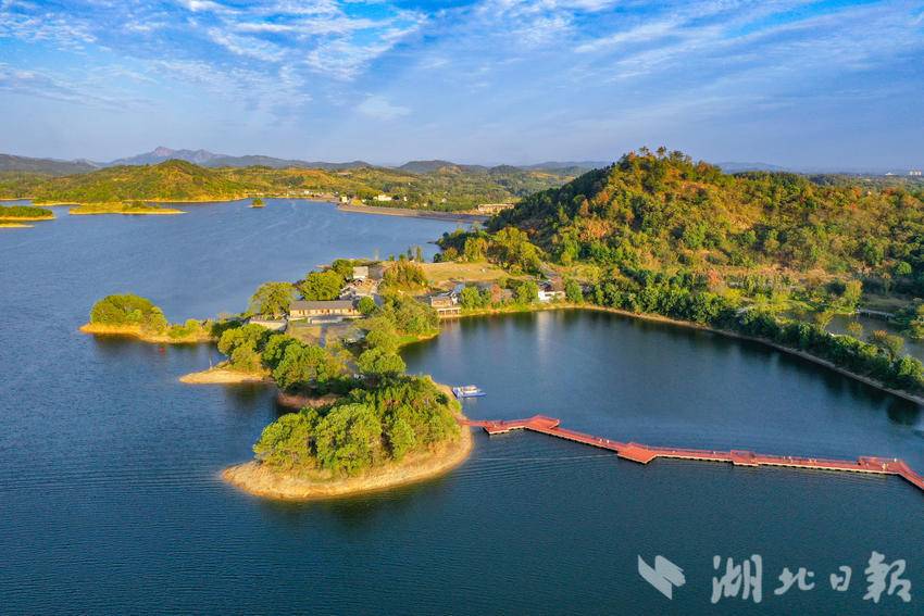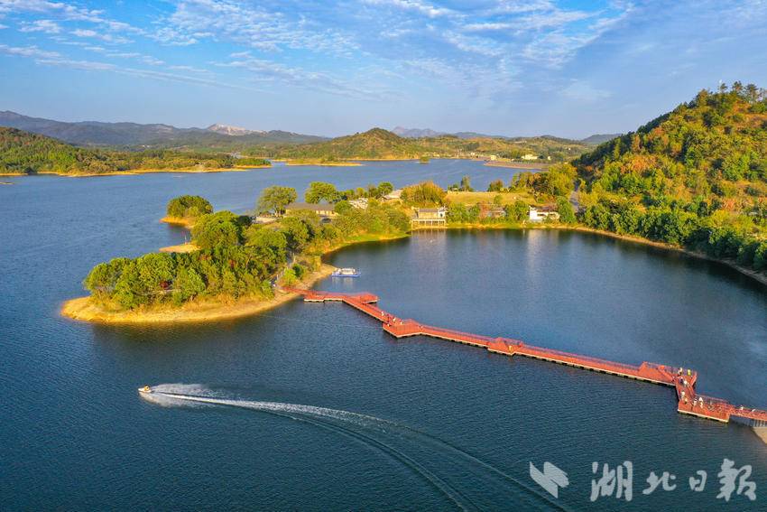 2024年10月3日,夕阳下的黄冈市团风县牛车河水库,蓝天如洗、水面波光粼粼、岛屿星罗棋布。游人或在栈桥上散步,或乘坐游船,欣赏着湖畔群山的迷人秋色。(湖北日报全媒记者倪娜摄)
