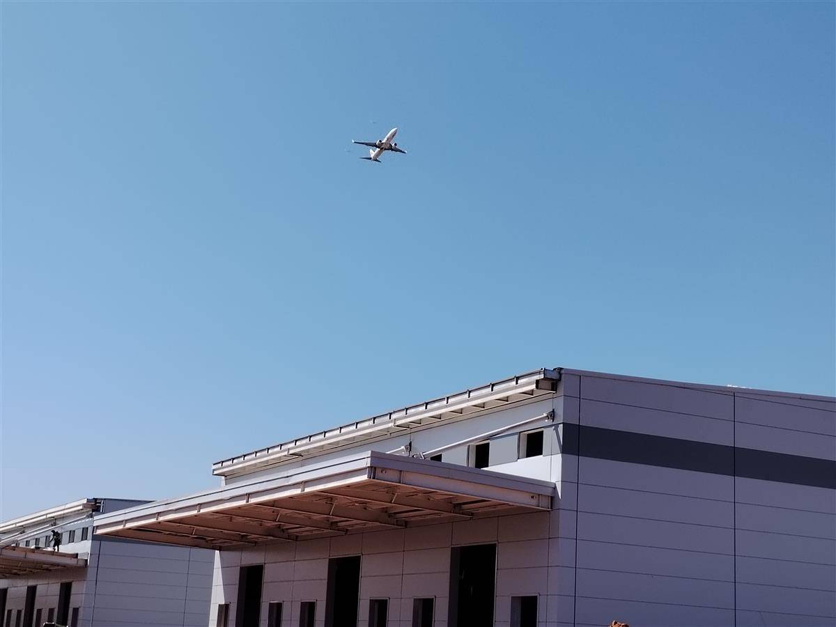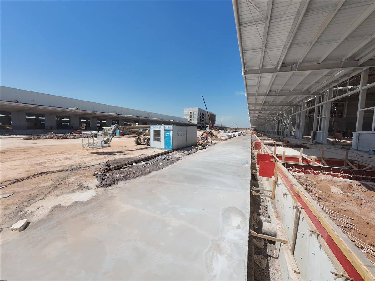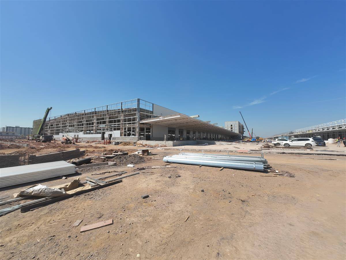 放眼望去,三栋保税仓库、两栋保税加工厂房、一座海关卡口以及危险品库区等主要建筑,已完成主体结构封顶。工人们正在对仓库外立面进行墙面板焊接、外墙粉刷;仓储中心主干道上,混凝土罐车正在抓紧时间浇筑。