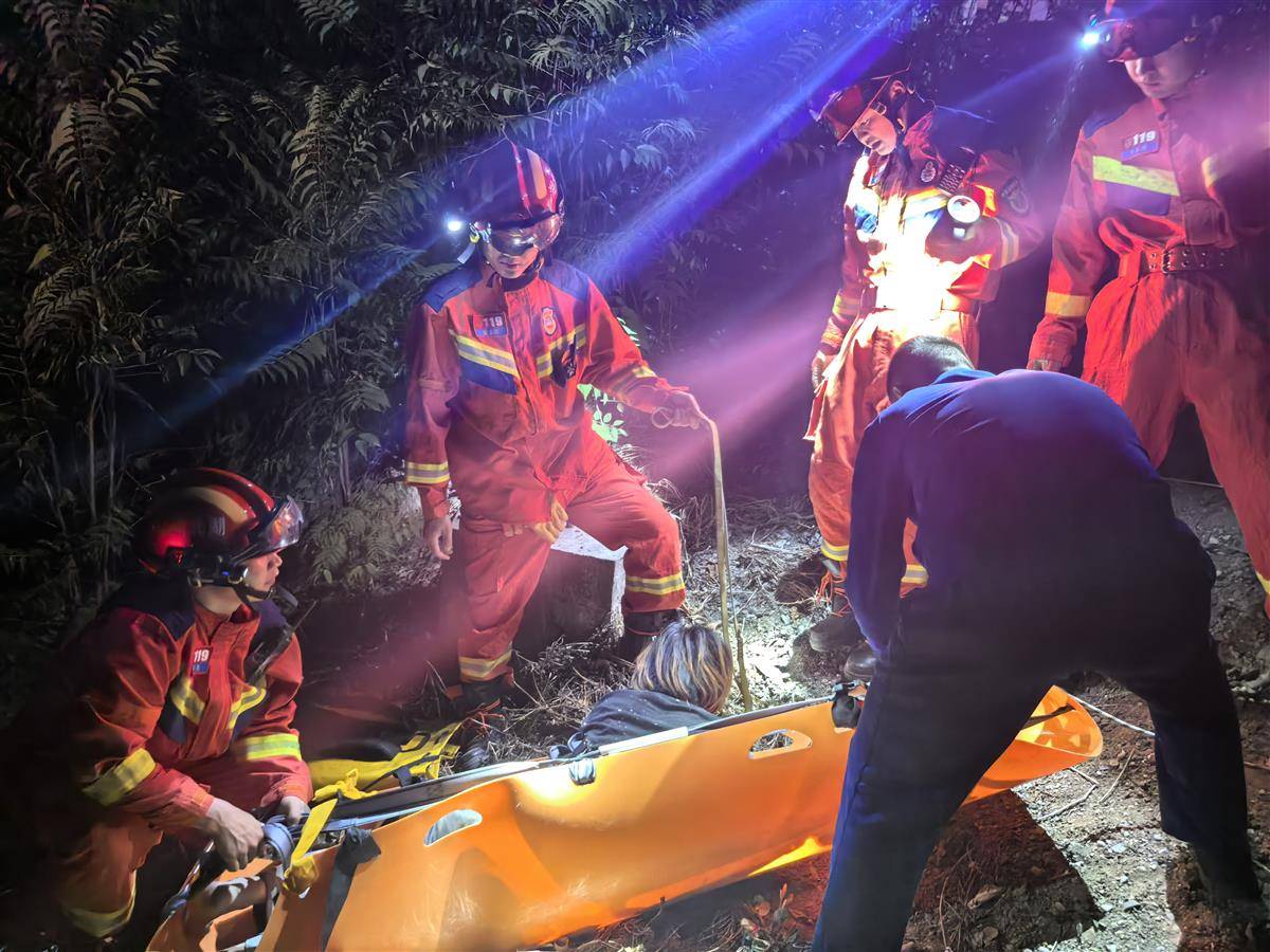 消防救援人员到场勘查,发现被困人员为一名女性,不慎坠坎的位置处于约30米的坡底。因护坡为疏松的建筑,无承重支撑,顺坡而下,不时有泥土滚落,危及被困人员安全。为尽快转移被困女子,救援人员携带绳索、多功能担架和护具深一脚浅一脚,在绳索的保护下艰难到达被困人员位置,查探人员情况。经过大约半个小时的紧张救援,该女子被成功转移至路面上并移送医护人员。