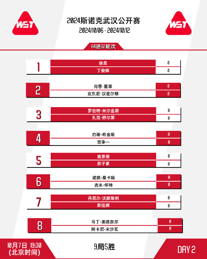 10月6日晚,2024中国光谷世界斯诺克武汉公开赛(简称“2024斯诺克武汉公开赛”)开杆仪式举行,比赛正式开幕。本届比赛由世界职业比利与斯诺克协会(WPBSA)、中国台球协会(CBSA)、武汉市体育局、武汉东湖新技术开发区等主办,为期7天,持续至10月12日。来自11个国家的70名运动员将进行72场较量,世界排名前16的顶尖选手中,有10人到场参赛。和去年一样,本届赛事“中国军团”阵容依然强大,包含世界第9丁俊晖、世界第11张安达以及4名外卡选手,共有19人将参加正赛争夺。