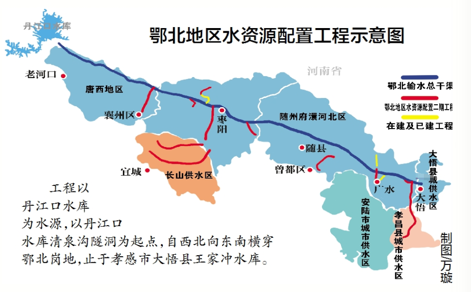 该工程以丹江口水库为水源,以丹江口水库清泉沟隧洞为起点,向鄂北地区沿线襄阳、随州、孝感供水。