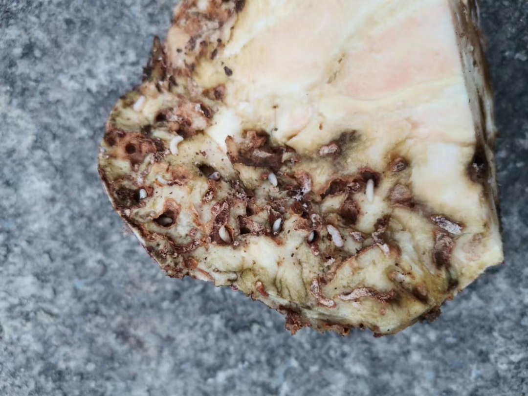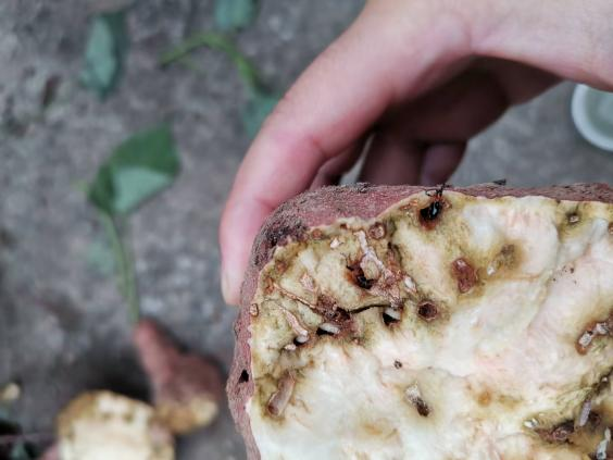 近日,我县农户采挖红薯时发现块根内有许多虫体和排泄物,造成薯块腐烂霉坏,变黑发臭,失去食用价值。经农技人员现场确认,该症状由甘薯小象甲危害导致,甘薯小象甲属鞘翅目象甲科,又名甘薯蚁象,俗称甘薯蛆。