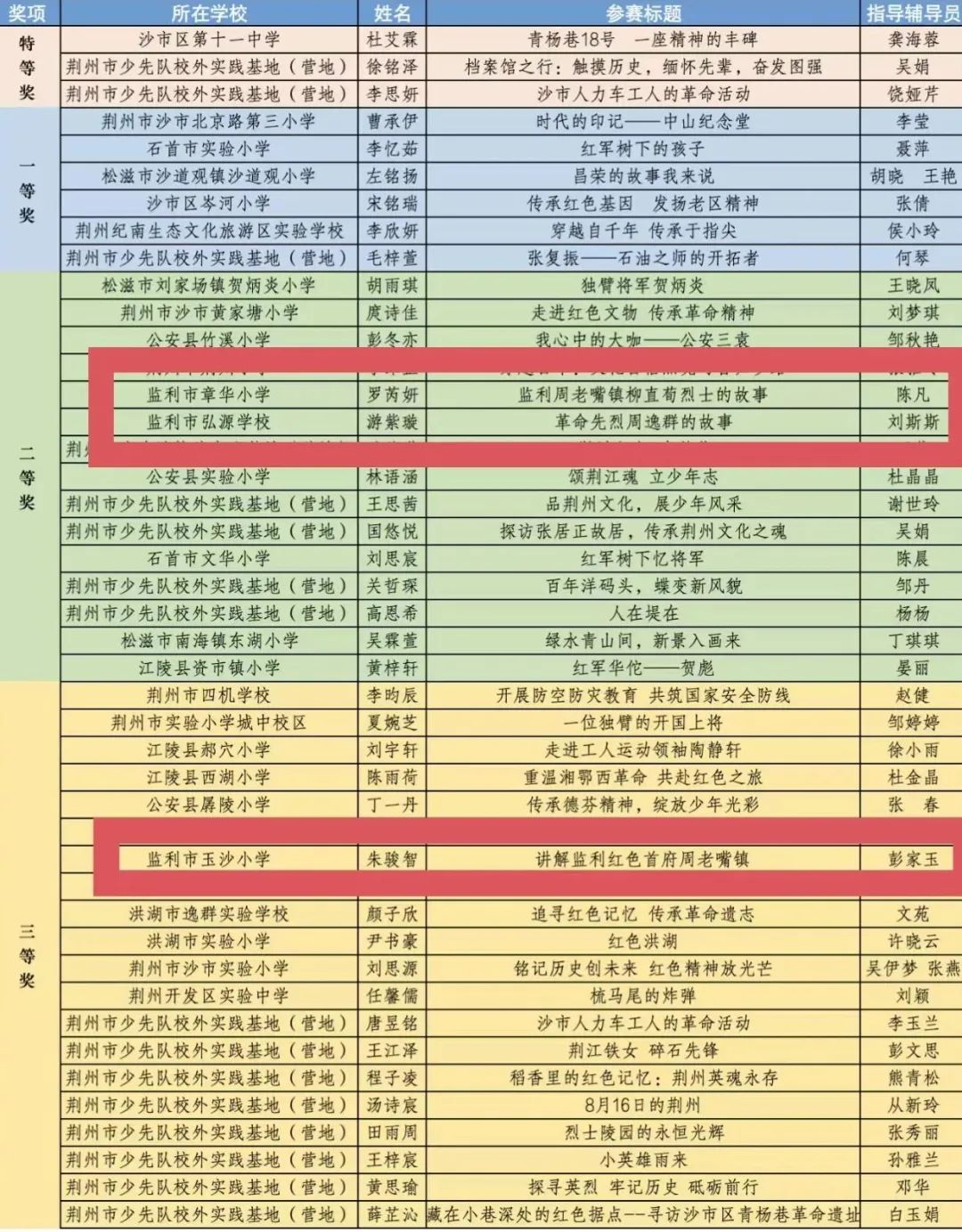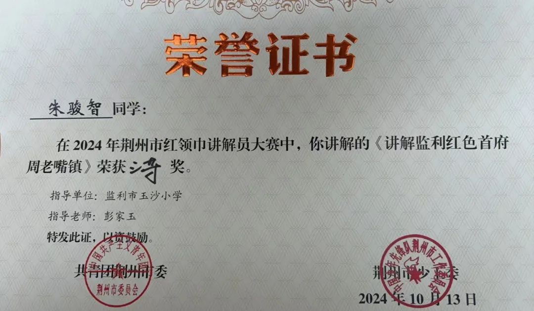 玉沙小学五(6)中队队员朱骏智讲解作品《监利红色首府周老嘴镇》荣获荆州市2024年红领巾讲解员大赛三等奖。