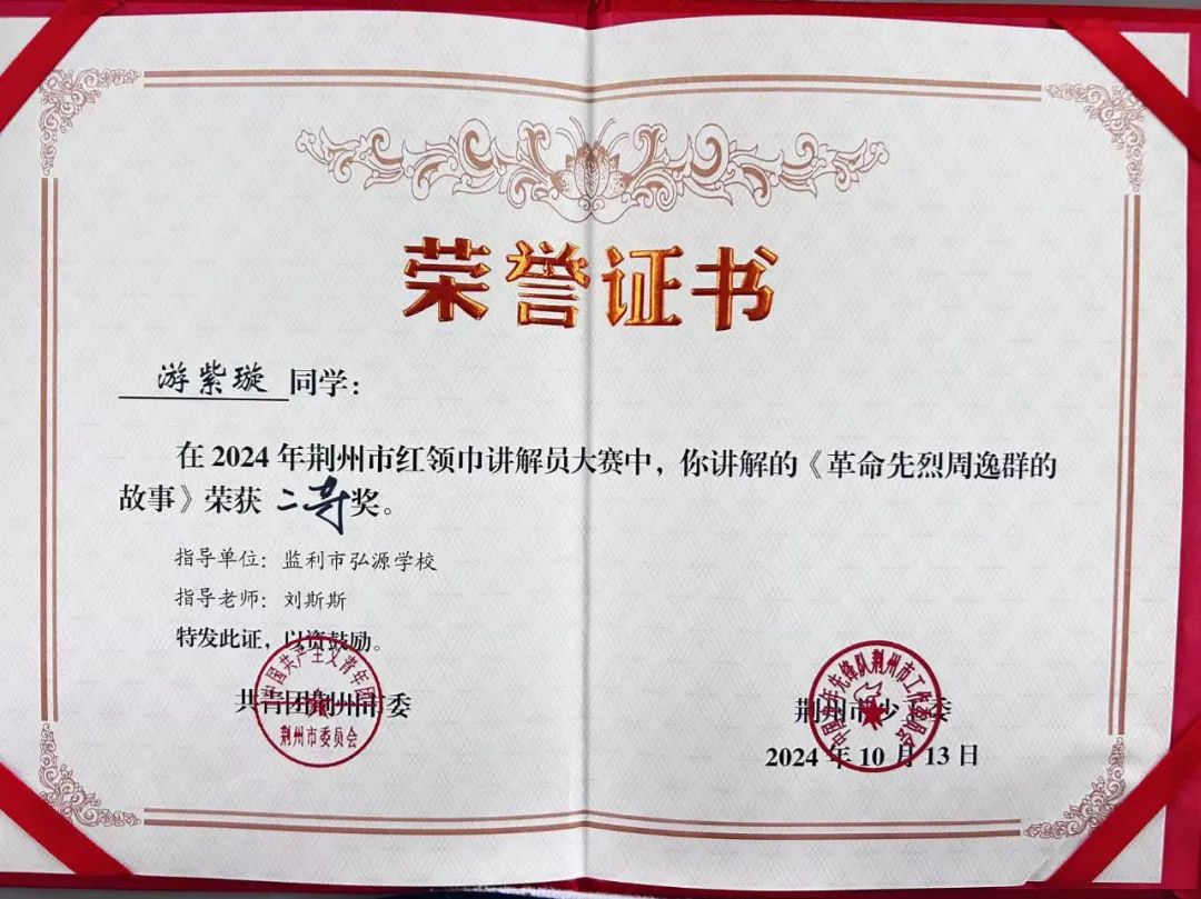 弘源学校七(8)中队队员游紫璇讲解作品《革命先烈周逸群的故事》荣获荆州市2024年红领巾讲解员大赛二等奖。