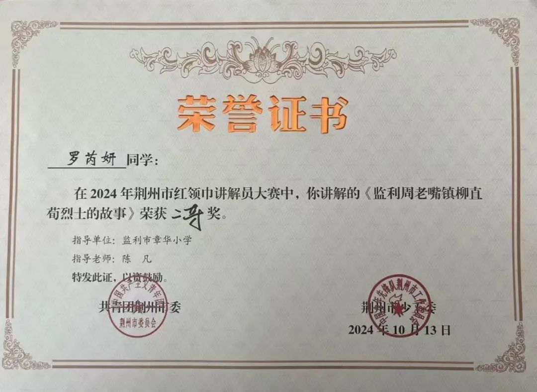 章华小学六(9)中队队员罗芮妍讲解作品《监利周老嘴镇柳直荀烈士的故事》荣获荆州市2024年红领巾讲解员大赛二等奖。