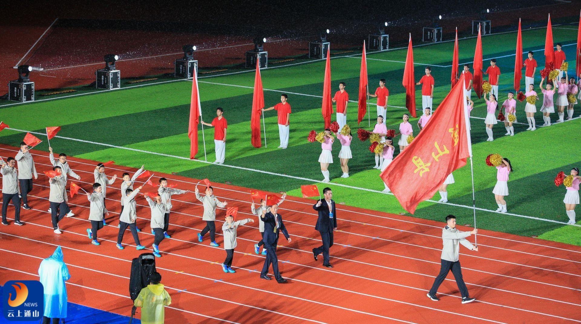 19时30分,激昂的运动员进行曲响起,在现场观众热烈的欢呼声中,8名护旗手迎着风雨,护卫着国旗步履铿锵,紧随其后的是来自全市的运动员、教练员和裁判员代表,他们精神抖擞,在欢呼声中依次入场。雨水打湿了他们的衣衫,却无法阻挡他们坚定的步伐,展现了他们昂扬的斗志和饱满的精神状态。当东道主通山代表队入场时,现场观众的掌声与欢呼声更是达到高潮,为市运会的开幕注入了无限活力与热情。运动员、裁判员、教练员代表依次宣誓,他们坚定的眼神和铿锵有力的誓言,彰显了对公平竞赛和体育道德的坚守。随着国歌音乐的奏响以及全体合唱,点燃了全体人员热血与激情。