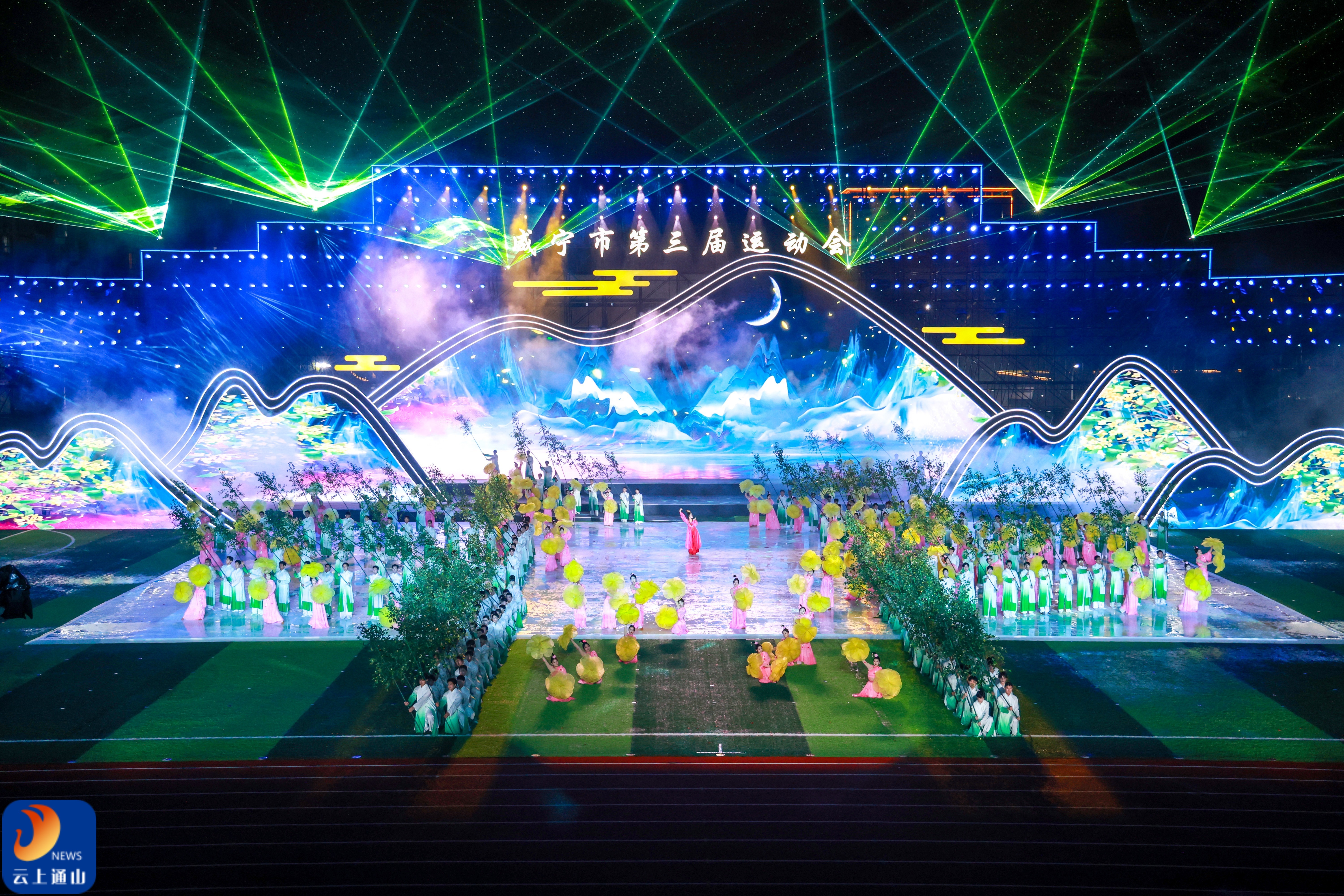欢聚山水间,跃动新华章,开幕式由序幕《相约通山》,三大篇章“山魂‐岁月”、“水韵‐家园”和“筑梦‐腾飞”构成。节目中,舞蹈诗《桂乡月影》以其婀娜多姿的舞蹈,柔情似水的呈现,生动地表达了咸宁人民热爱生活的美好情操和创造幸福的奋斗风采;铿锵的节奏,粗犷的气势,豪迈的舞步,激昂的情绪,男子舞蹈《幕阜山魂》,表现了咸宁人民不畏艰险、勇攀高峰的坚强意志和不忘初心、矢志奋斗的英雄品质....舞蹈、音乐和科技元素的完美融合,为观众呈现了一场视觉与听觉的双重盛宴,五彩斑斓的灯光点亮了开幕式的夜空,也点亮了运动员们心中的梦想与希望。