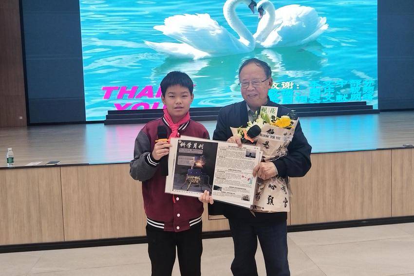 我校陈吉安同学对张教授进行了采访,并送上学生自制的《科学半月刊》。