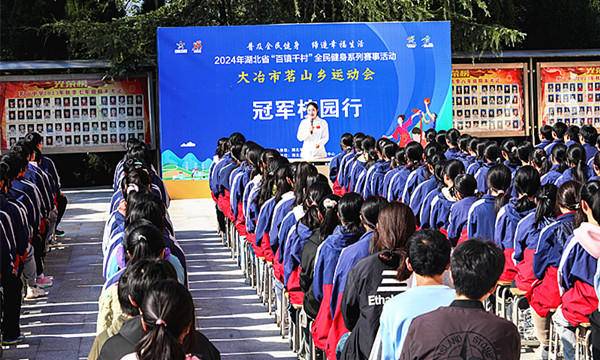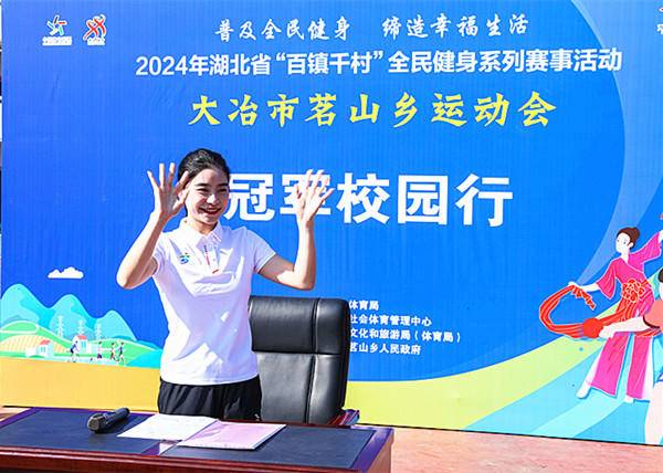 湖北日报讯(通讯员金美妍、王芳、张晓芳、柯铭锟)10月25日,2024年湖北省“百镇千村”全民健身系列赛事活动在大冶市茗山乡如火如荼开展。在举行了茗山乡运动会开幕式后,国家前女子跳水运动员、世界冠军、奥运冠军、湖北省跳水队领队、湖北省游跳中心副主任刘蕙瑕分别走进茗山中学、中心小学、杨桥小学,开展了3场振奋人心的体育精神传递之旅——“冠军校园行”。
