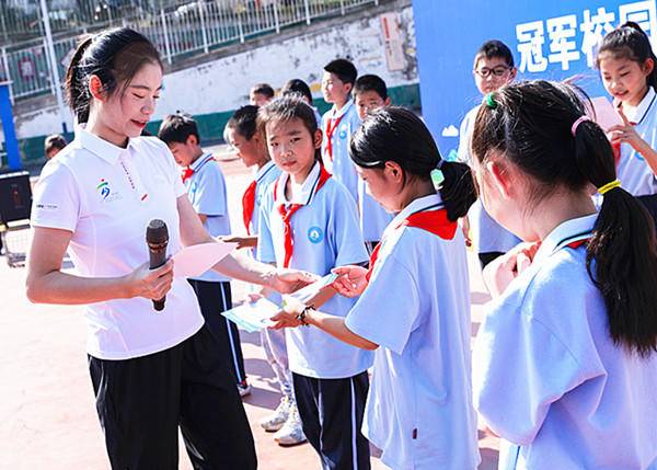 世界冠军走进校园,以榜样力量传递体育精神。在三所学校校园里,当世界冠军刘惠瑕即将离场之际,孩子们怀着对冠军的崇敬之情,纷纷涌到台前开心地向冠军索要签名卡并进行合影。刘惠瑕为同学们分发了签名卡,也让大家定格了这一刻美好的时光,留下幸福的回忆。茗山乡中心学校督导员徐学理说,此次“冠军进校园”活动,让全体师生感受到了冠军榜样的力量,激发师生们积极向上的体育竞技热情,我们定会将体育精神融入日常工作、学习和生活中,倾心自我成长,持续强健体魄,为提升综合素养筑牢根基。