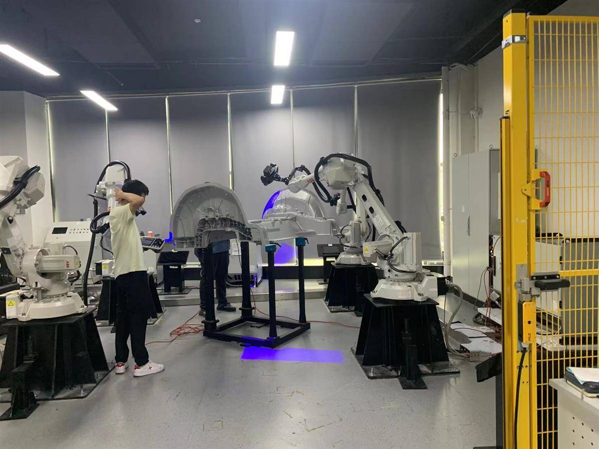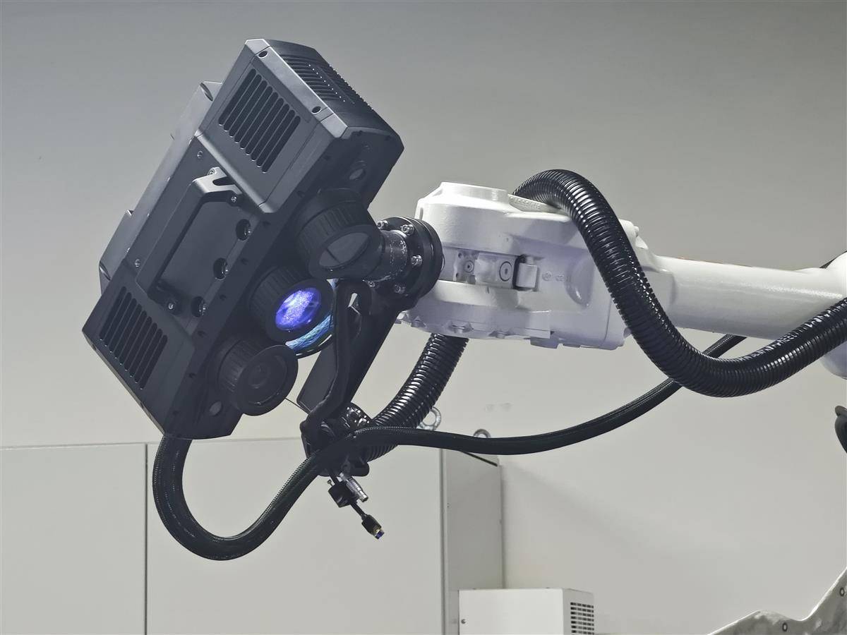 近日,湖北日报全媒记者在武汉惟景三维科技有限公司看到,还未涂装的电池包、车架、车门等车身零部件正在进行测量试验。在机器臂前端,安装着一个类似“投影仪”形状的设备,中间发射蓝光扫描,两侧摄像头犹如炯炯有神的“眼睛”,精准定位零部件里里外外每一个细节。