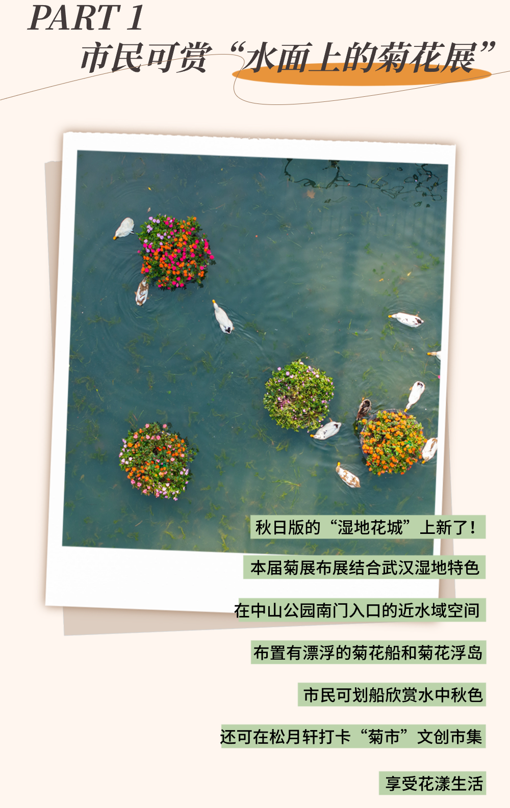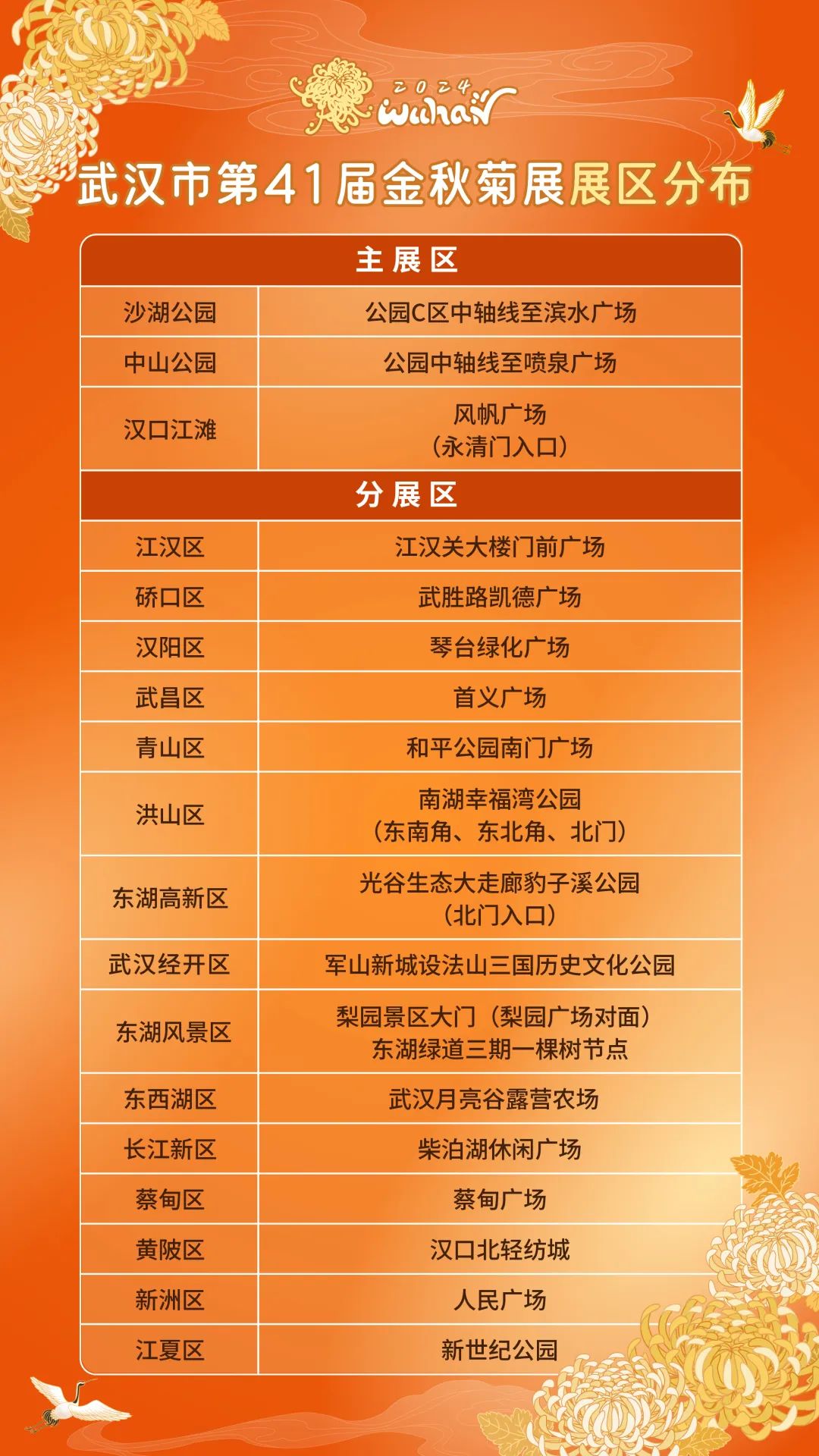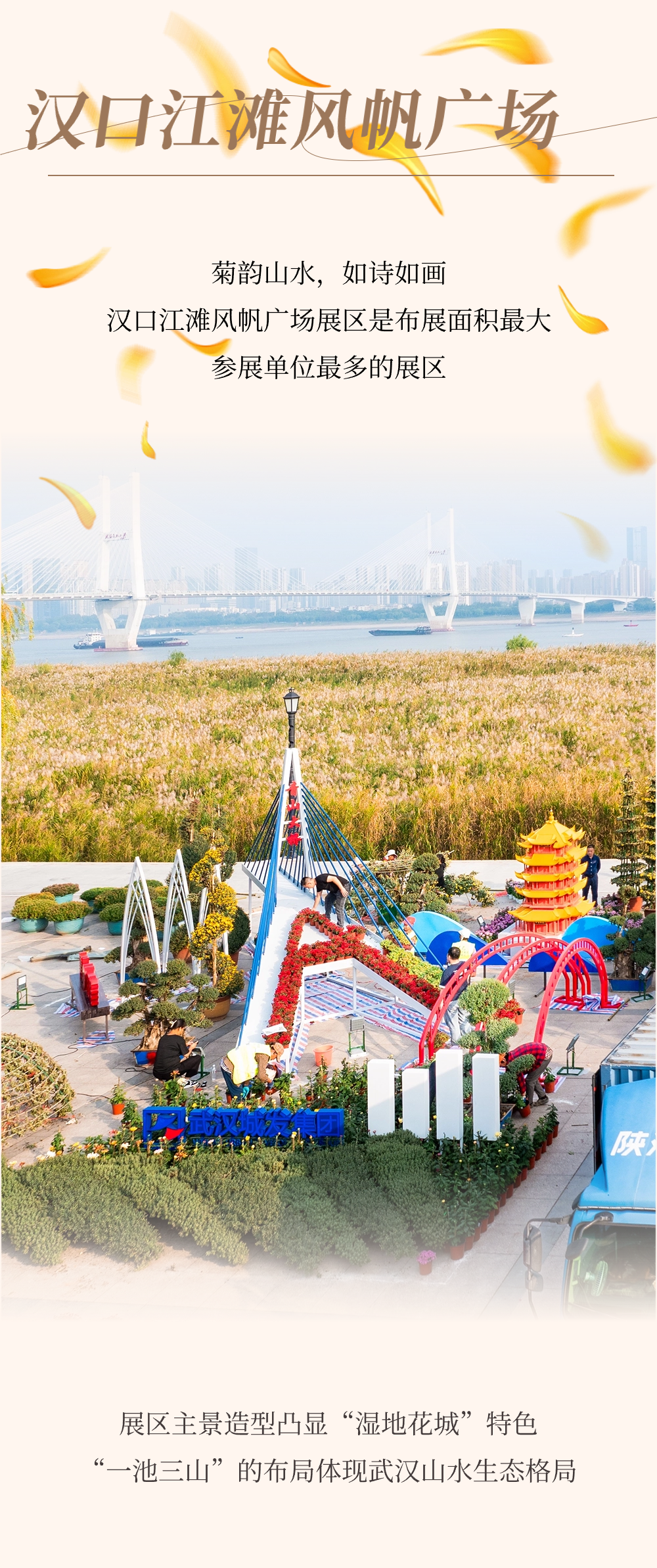 本届金秋菊展,沙湖公园C区、中山公园、汉口江滩风帆广场三大主展区颜值超高,各具特色。