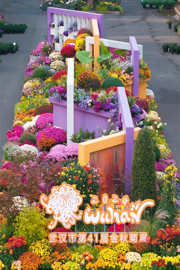 分展区的设计也各美其美。城市地标被金菊拥簇,江汉区在江汉关大楼前布展,将“产业升级”“产城人融合”等理念融入造景;武昌区将蛇山脚下的首义广场南广场整体变成大花园,围绕广场大型音乐喷泉,花艺布置横跨东西、贯穿南北,展区夜景还与黄鹤楼夜景融为一体;东湖风景区则在梨园大门以及今年全新开放的东湖绿道三期“一棵树”节点布展……