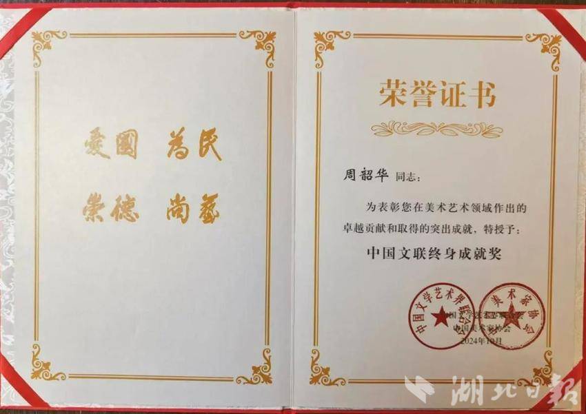 10月24日,第四届“中国美术奖”在京颁奖,湖北省美术院原院长、省文联原主席、湖北省国画院终身名誉院长,现年95岁的国画大师周韶华先生荣获“中国文联终身成就奖”,是本次全国获奖的6位德高望重的美术家之一。