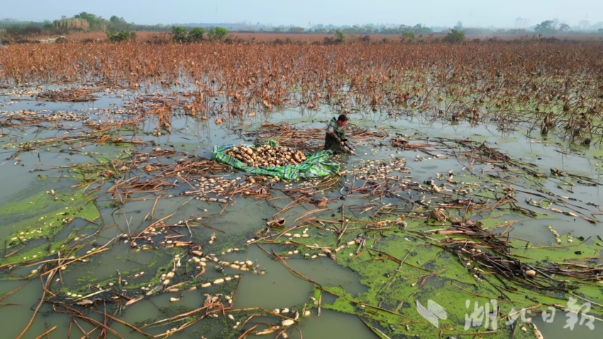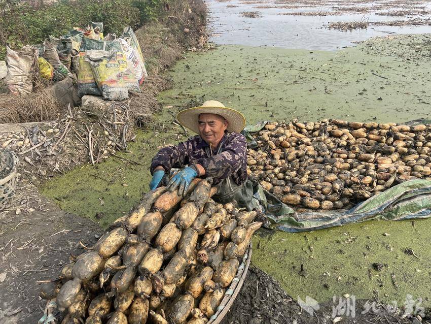 绿意渐褪,残荷留香。眼下,正值汉川莲藕上市的季节。11月1日,在汉川市沉湖镇红丰村的磊瑞种养殖专业合作社莲藕种植基地,10余名挖藕工身着防水衣,手持高压水枪对着淤泥“嘭嘭”冲刷,肥硕的莲藕接二连三地冒了出来……