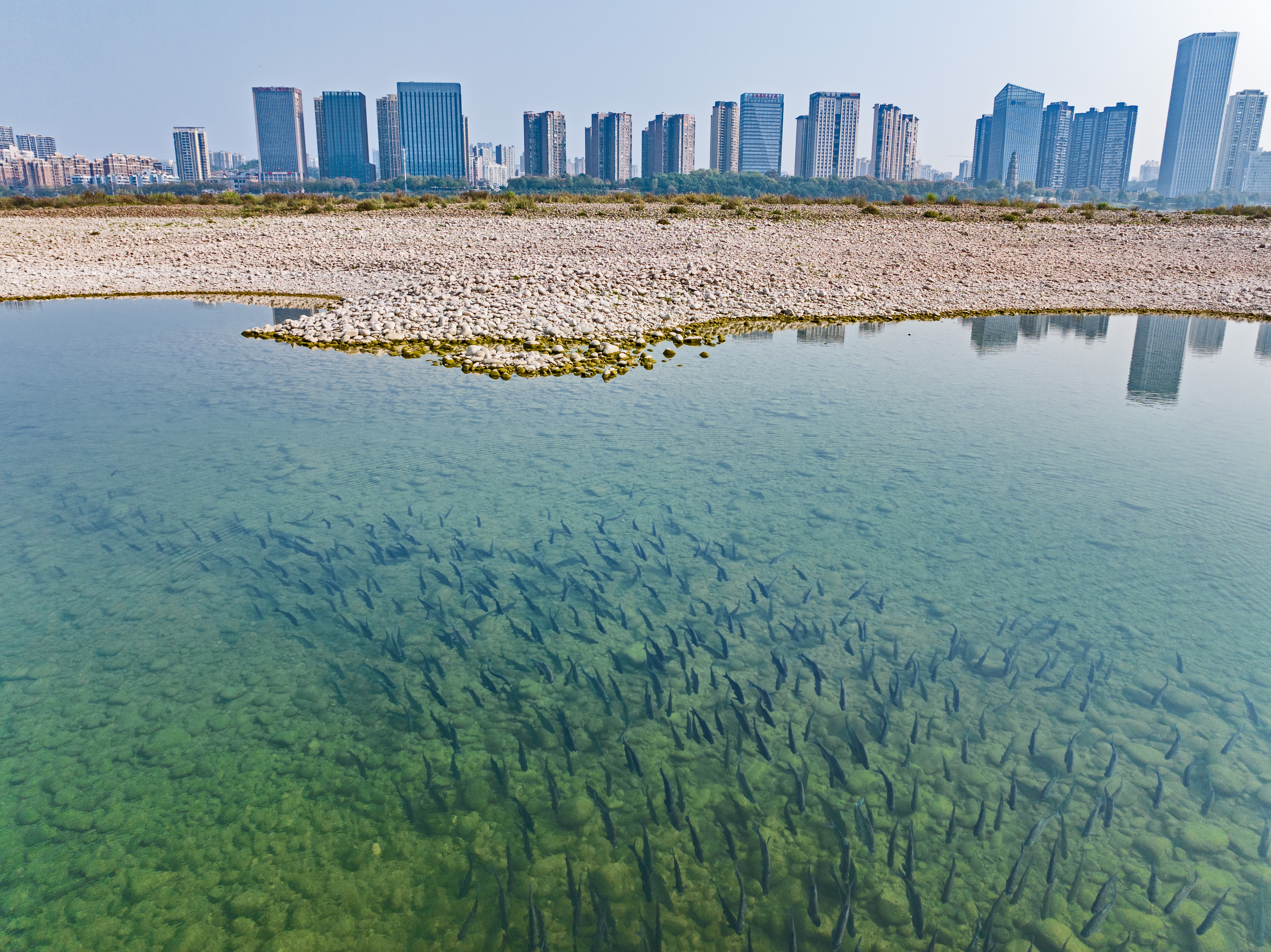 11月5日,长江宜昌段因枯水季节,长江江底的胭脂坝大面积裸露出来,形成一个个江中沙丘与水塘,成群野生长江鱼隔离在水塘中,形成独特的鱼翔浅底景观。当前,长江流域雨水偏少,加上三峡水库蓄水,中下游水位持续退落,宜昌江段进入枯水期。随着“长江大保护”和“十年禁渔”等政策的实施,长江干流宜昌段,禁捕禁钓的成效已经开始显现,“四大家鱼”等常见的淡水鱼明显增多了,一些珍稀鱼种也开始频频现身宜昌,长江生态一年好过一年。(湖北日报全媒记者 刘曙松 摄)