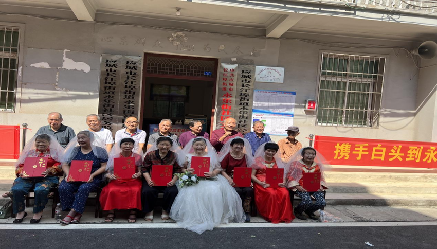 长江埠街道永乐街社区8对金婚夫妇与自己的金婚证书合影