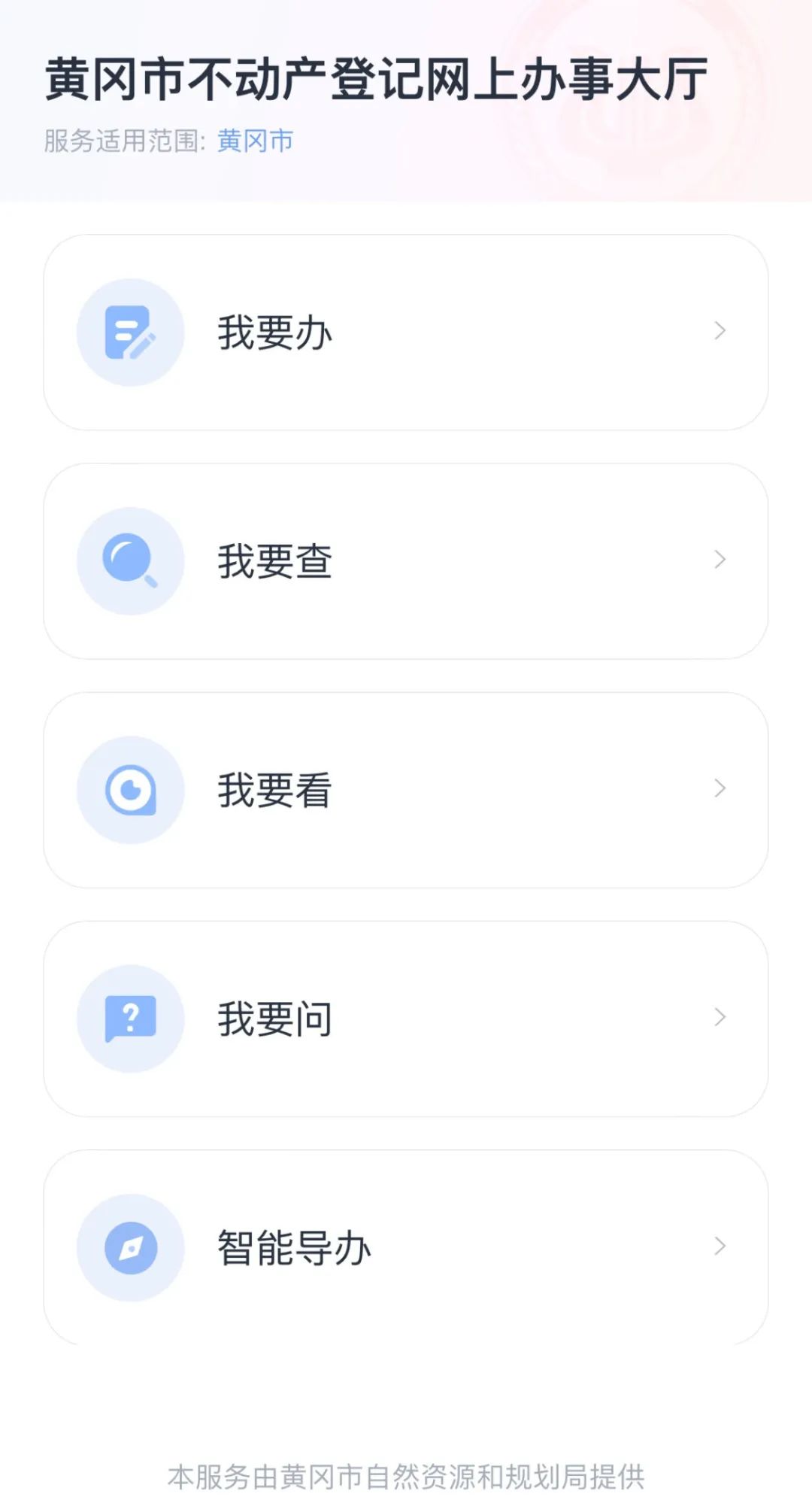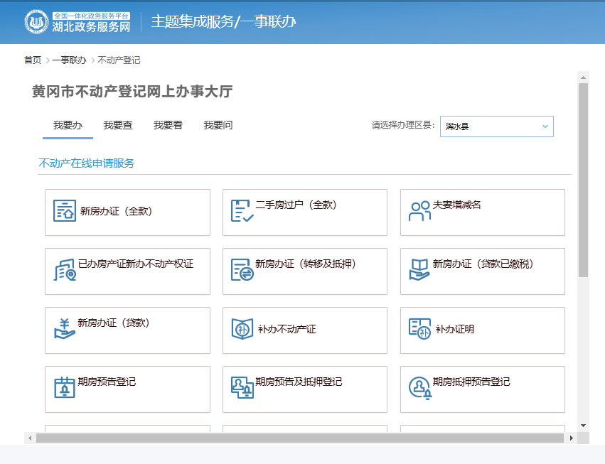 2.在“黄冈市不动产登记网上办事大厅”下方选择“我要办”,新房办证请选择“不动产转移登记”。