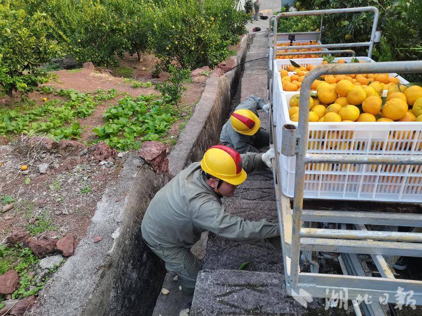 在东瀼口雷家坪社区宋家梁子片区,东瀼口供电所组织的“鄂电红马甲”行走在田间地头,检查运输柑橘的电动轨道,查看电源是否可以正常启动、轨道链条是否松动等,为电动轨道正常运转保驾护航。