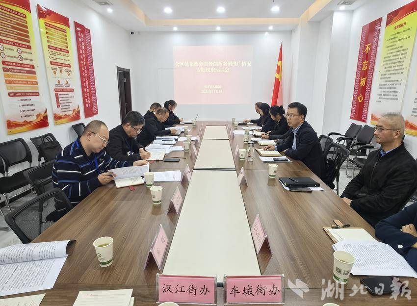 座谈听取了区数据局、市公安局张湾分局、区税务局、区人社局、区医保局、区市场监管局、汉江路街道、车城路街道,关于优化政务服务创新案例推广工作情况汇报。