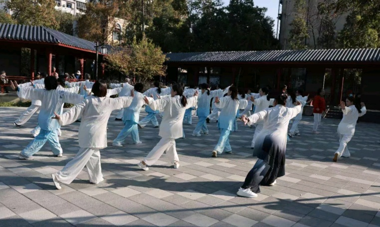 八段锦班师生统一身着洁白绣花的练功服,在轻盈、幽静、舒缓、悠扬的古筝《云水禅心》轻音乐声中,集体演练健身气功八段锦,神情轻松、专注,十多分钟的练身、练心、练气、练神,激发了刚阳之正气,冬日照暖全身,气血充盈五脏,脸色泛红,身心暖洋洋、喜洋洋、乐滋滋……