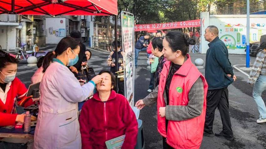 眼科检查和视力测试区域也同样繁忙。医务人员通过专业设备为居民进行视力检测和眼病筛查,普及眼部健康知识,并针对长时间使用电子设备的居民给出护眼指导。