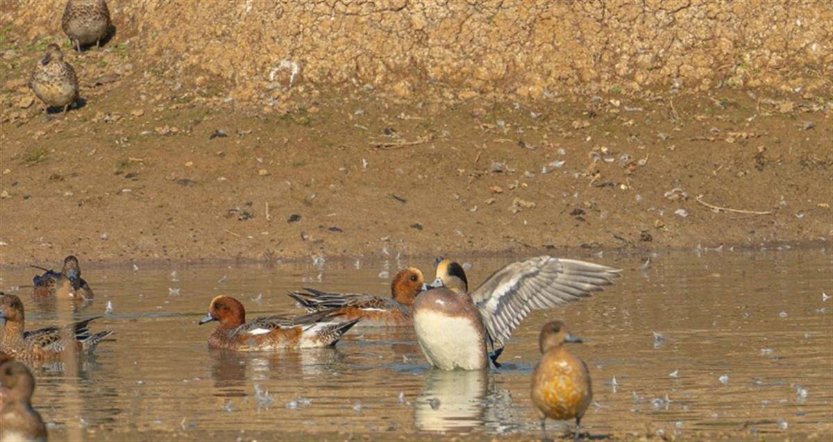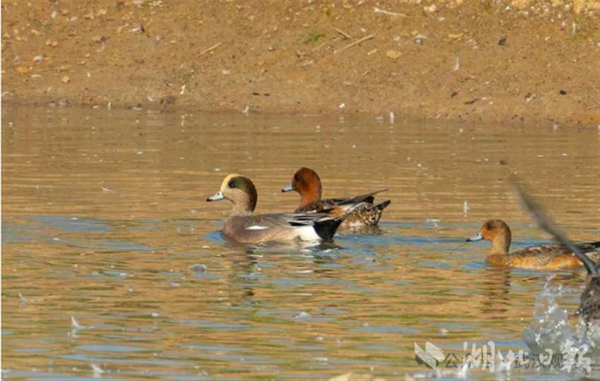 湖北日报讯(记者刘畅、实习生王学文)11月10日,武汉观鸟协会会员朱全宇在东西湖区柏泉街道府河河滩观测到了1只绿眉鸭(Mareca americana)。观测地点在府河柏泉段的天鹅湖候鸟保护区,这儿是武汉市重要的越冬候鸟栖息地。被发现时,绿眉鸭混在赤颈鸭群里,在水面游动嬉戏。