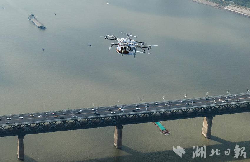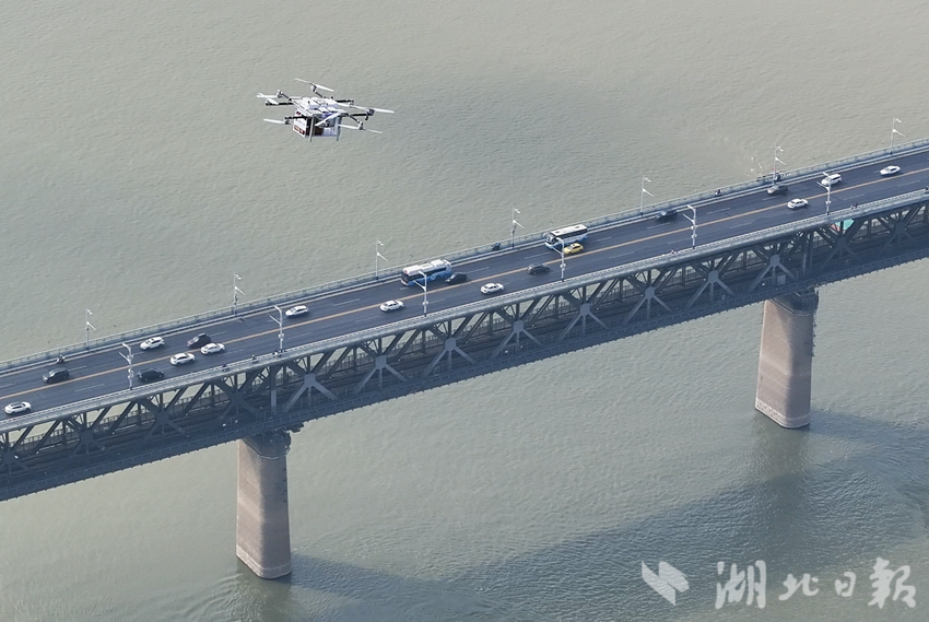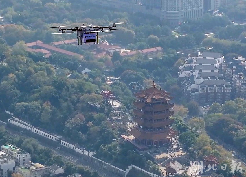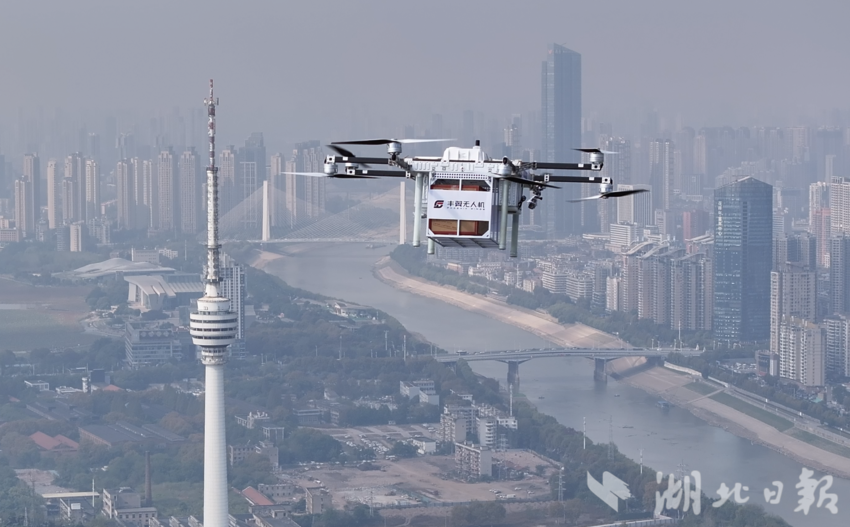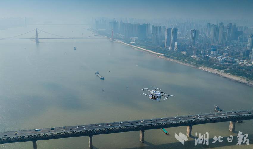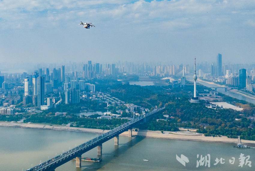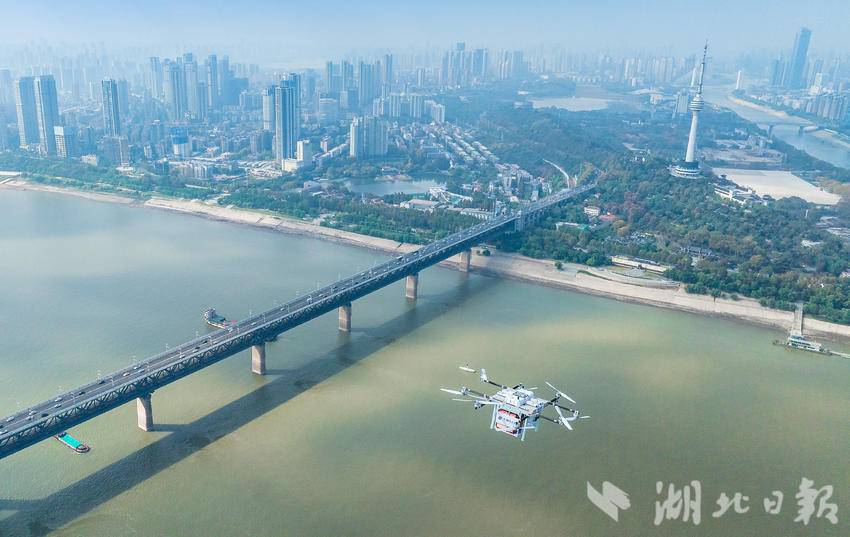 11月13日,一台装载着黄金和化妆品的无人机正在飞越长江。当天,一台方舟40顺丰丰翼无人机携带着顾客下单的黄金、化妆品从华中第一商圈武商MALL起飞,相继越过长江、汉江后,在全球最大纯商业体武商梦时代楼顶降落,标志着全国首条跨江商贸低空无人机航线正式首飞。(湖北日报全媒记者 柯皓 通讯员 王筝 摄)