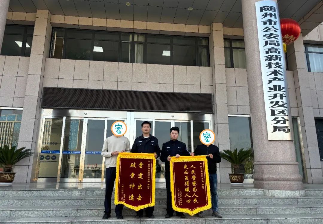 11月7日,来自浙江省台州市的个体户康先生将一面印有“人民警察为人民,失而复得暖人心”字样的锦旗送到随州高新区公安分局刑侦大队民警手中。