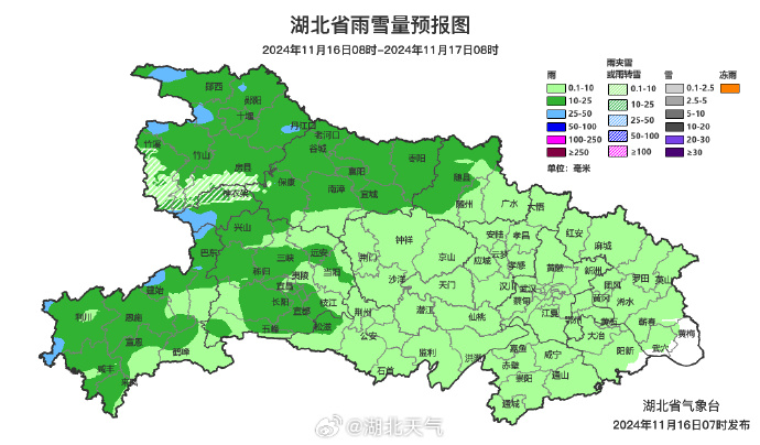 11月16日08时-17日08时,鄂西北、鄂西南阴天有小到中雨,局地大雨,其中鄂西北高海拔山区夜间有雨夹雪;其他地区阴天转小雨。最高气温西部15~19℃、东部20~25℃,最低气温鄂西北8~10℃、其他地区11~16℃,偏北风3到5级、阵风6到8级。