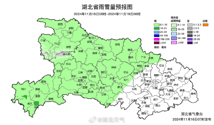 11月18日08时-19日08时,鄂西北、鄂西南阴天有小雨,局地中雨,其中鄂西北高海拔山区有雨夹雪或雪;鄂东南阴天转多云;其他地区小雨转阴天。最高气温西部8~11℃、东部11~16℃,最低气温6~11℃,偏北风3到4级、阵风5到7级。