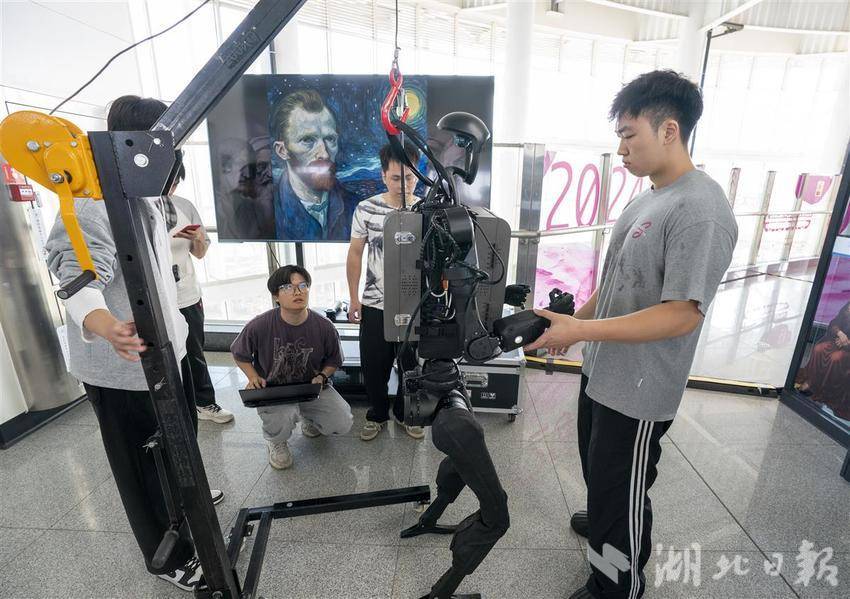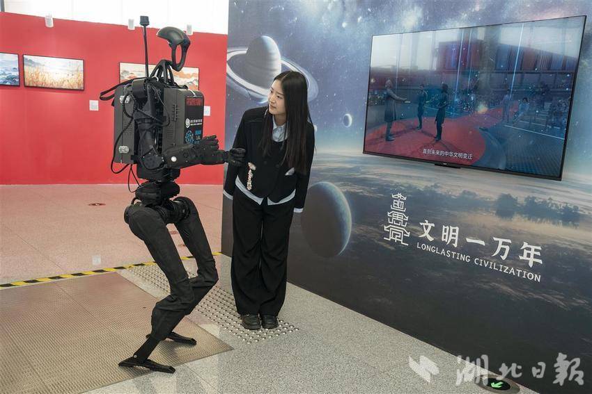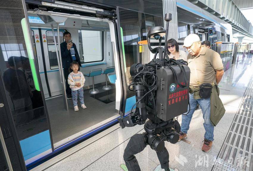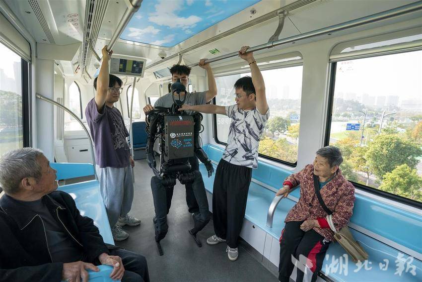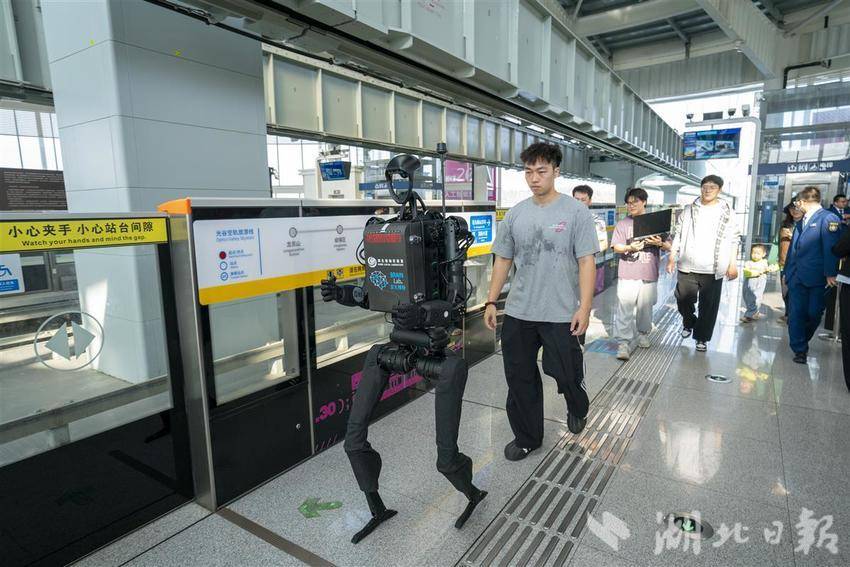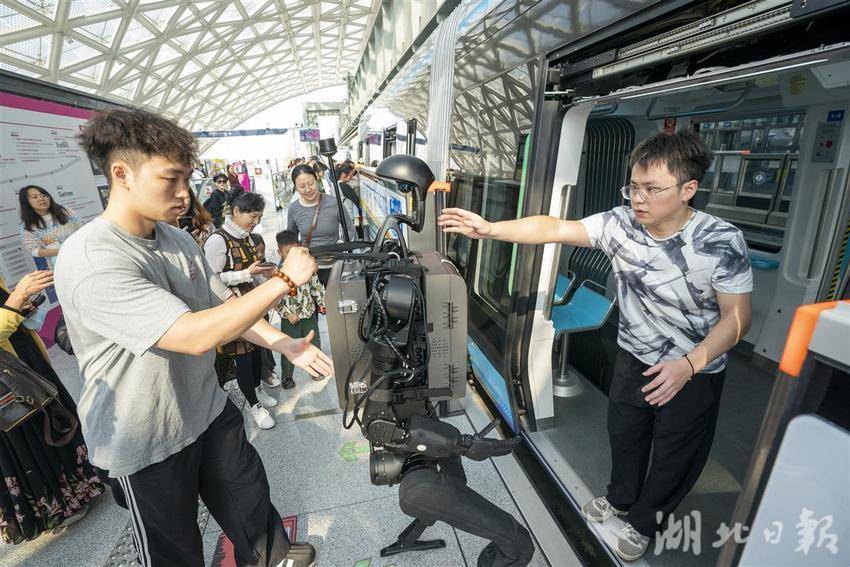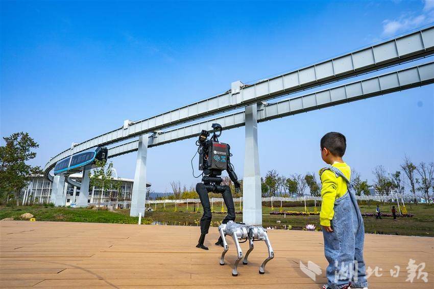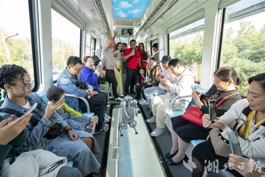 湖北日报讯(记者魏铼、通讯员张璨龙)11月14日,武汉东湖高新区空轨高新大道站,在光谷装上“智慧大脑”的人形机器人,乘空轨,看AI展,与小朋友在生态大走廊斗舞。