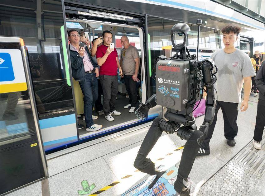 自主搭乘空轨的人形机器人,引来外国游客纷纷拍照。