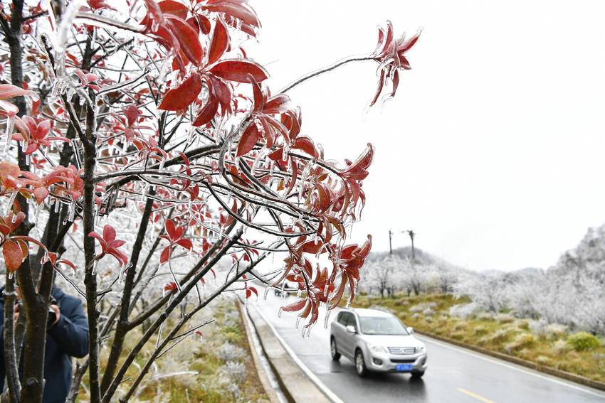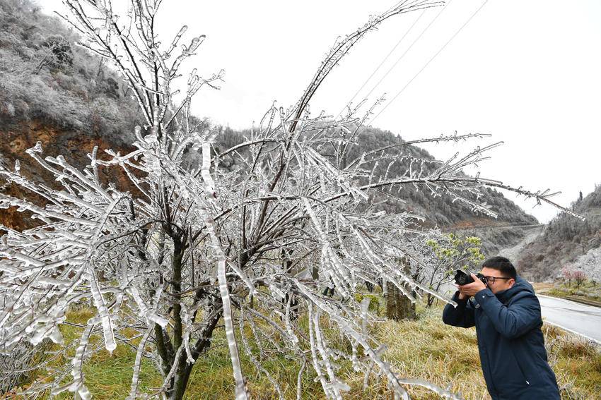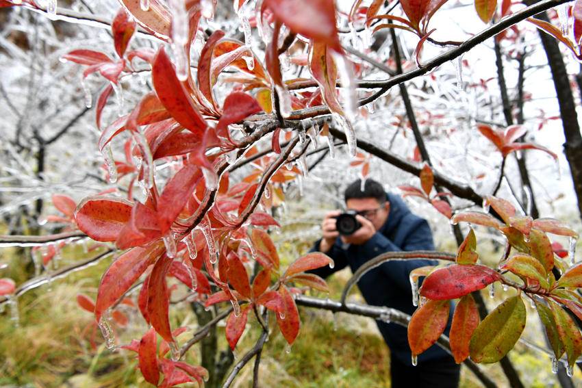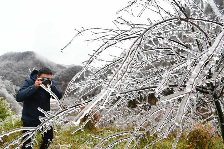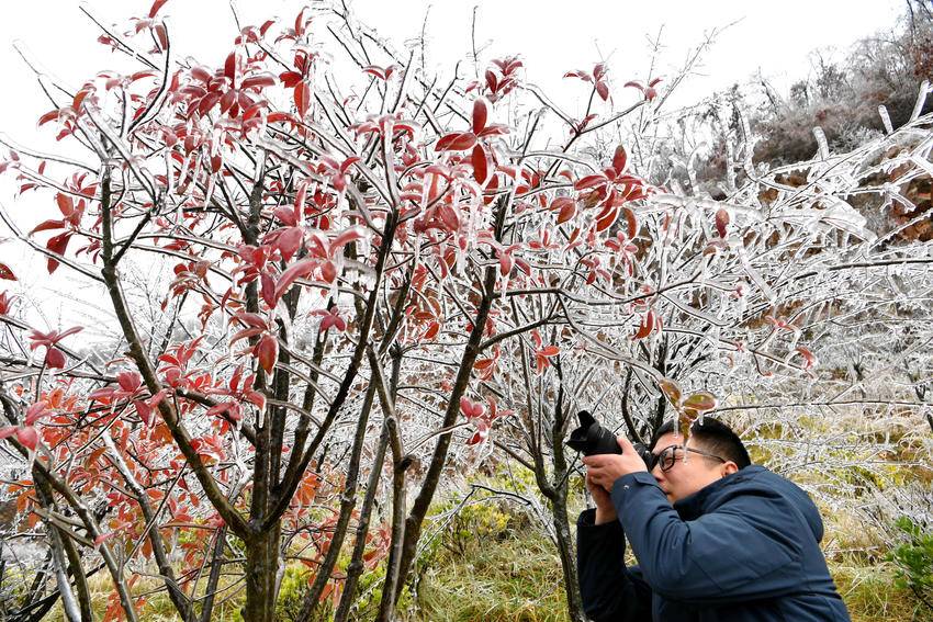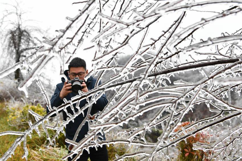 11月19日,一名摄影爱好者在保康县龙坪镇大水林场拍摄雾凇。