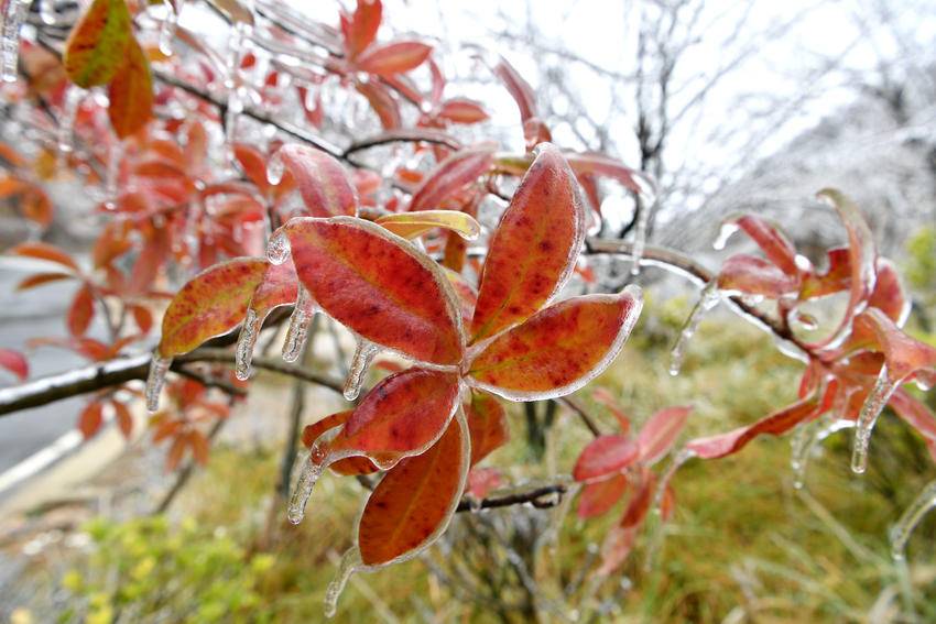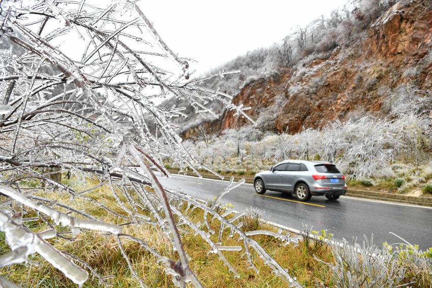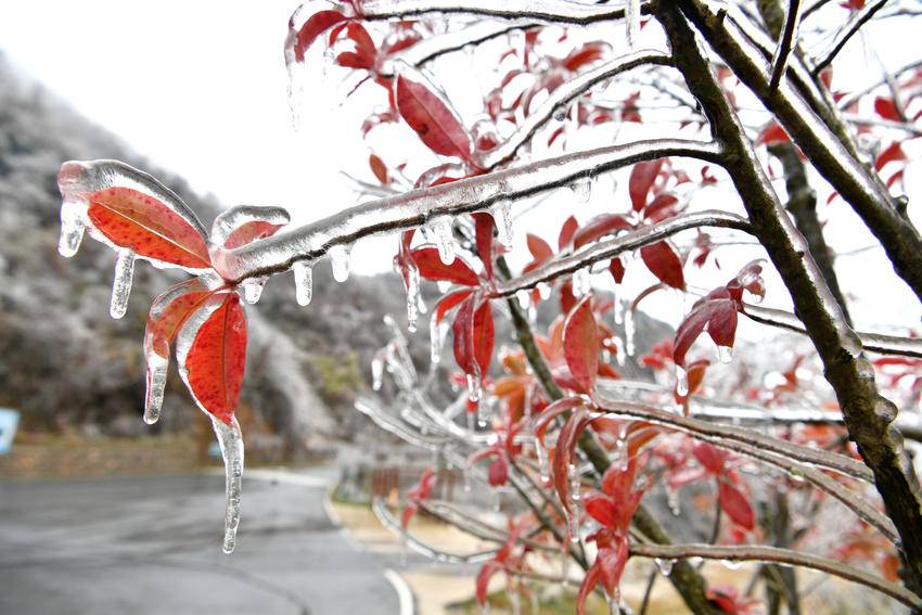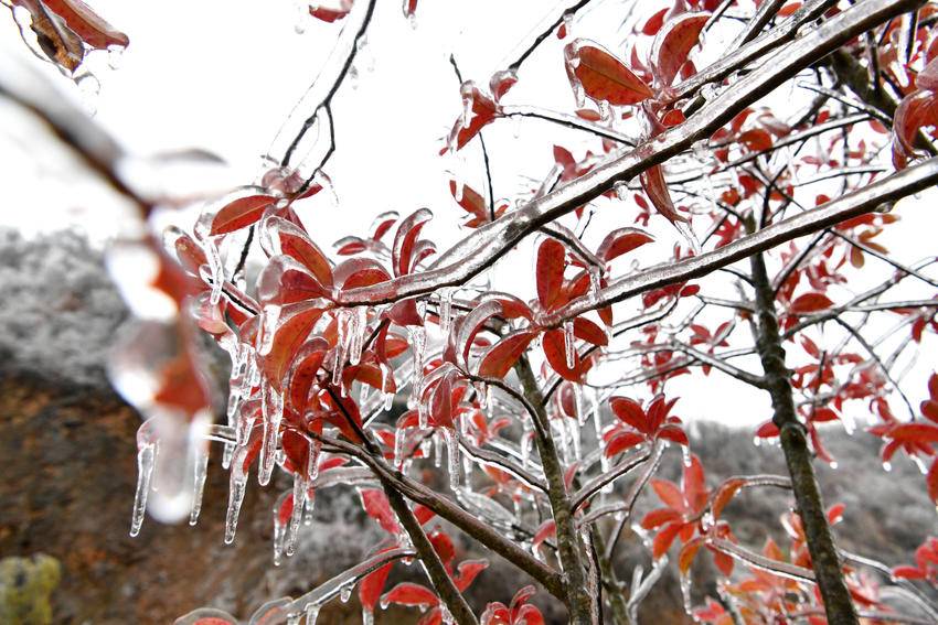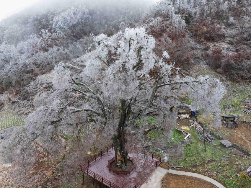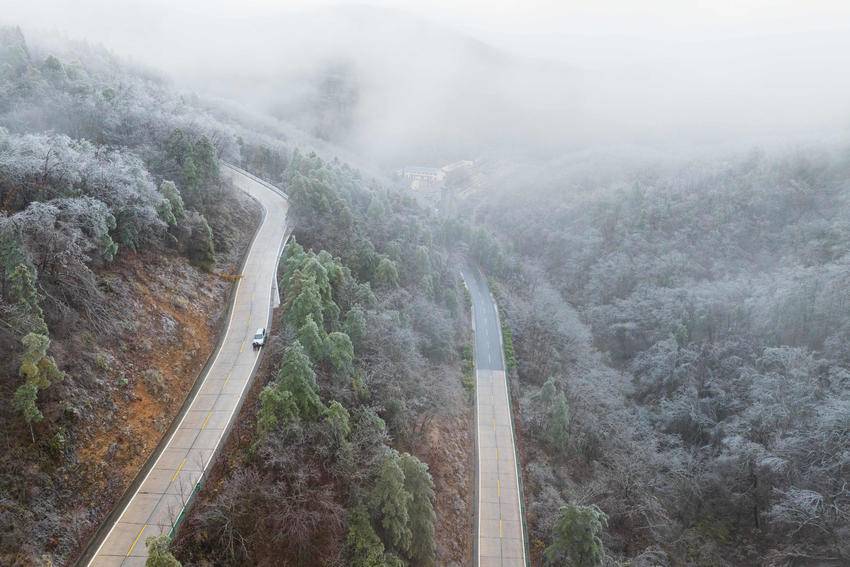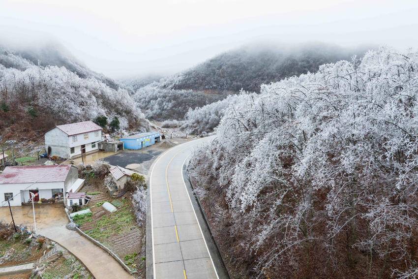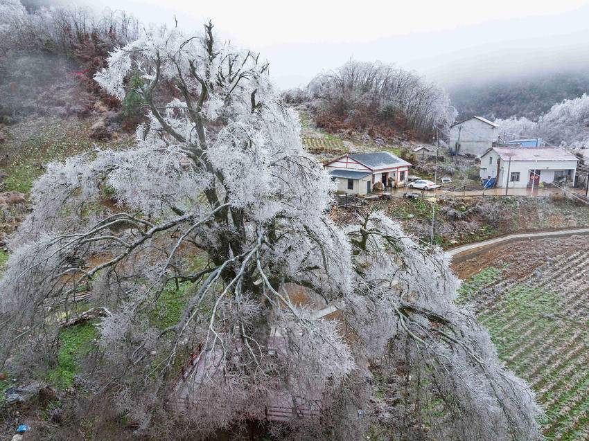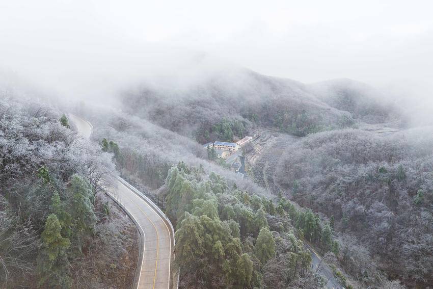 在冬日的清寒中,霜染寒枝,冰晶似幻,宛如大自然施展的一场奇妙魔法。冰晶凝结在枝头,像是串串璀璨的宝石,闪烁着冷冽的光芒。从空中俯瞰,整片树林银装素裹,山间雾气缭绕,构成一幅诗意满满的水墨画卷。(湖北日报客户端通讯员 杨韬 向宗涛 摄)