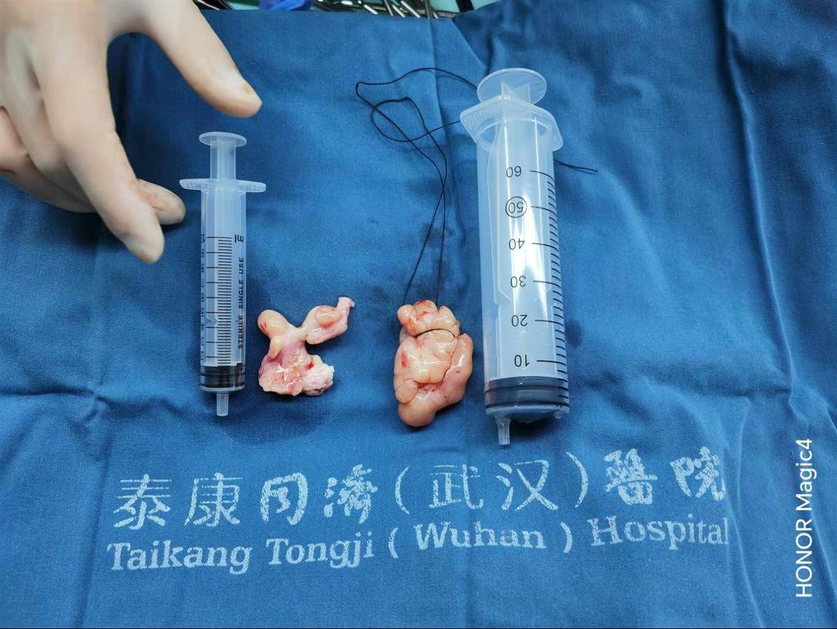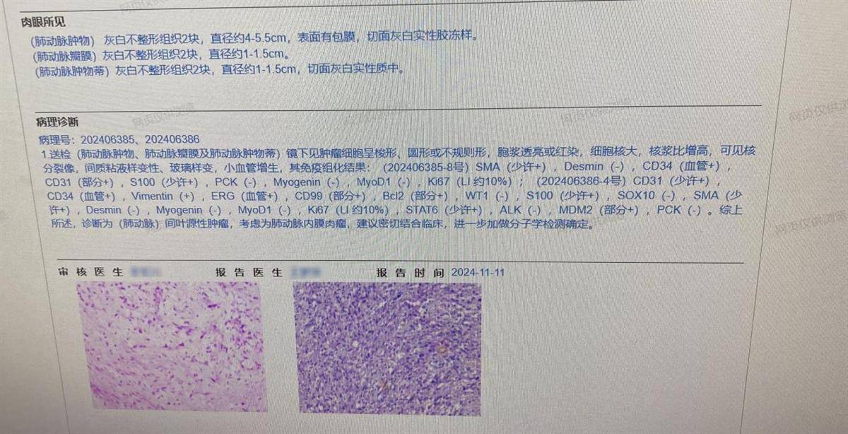 由于手术难度大、耗时长、风险高,对麻醉和体外循环都有很高的要求。术前,胸心外科组织了多学科会诊,对术后可能出现的严重并发症都做了详细预案。11月7日,经过近6个小时手术,张女士在泰康同济(武汉)医院接受了体外循环下肺动脉肿物切除术+肺动脉干修补术+三尖瓣成形术,肺动脉肿瘤被完整切除。术后切除的病理组织经检测,确诊为罕见的肺动脉内膜肉瘤。