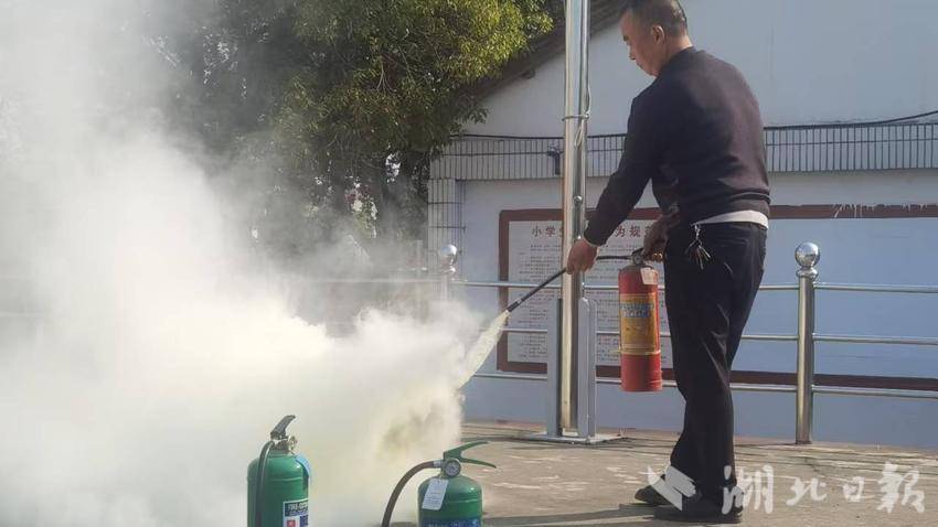 随后,在大操场上,负责学校安保的老师通过实地操作干粉灭火器和水基灭火器模拟火灾场景,详细介绍了消防设施的位置和使用方法,分享了一些日常生活中的消防小常识。